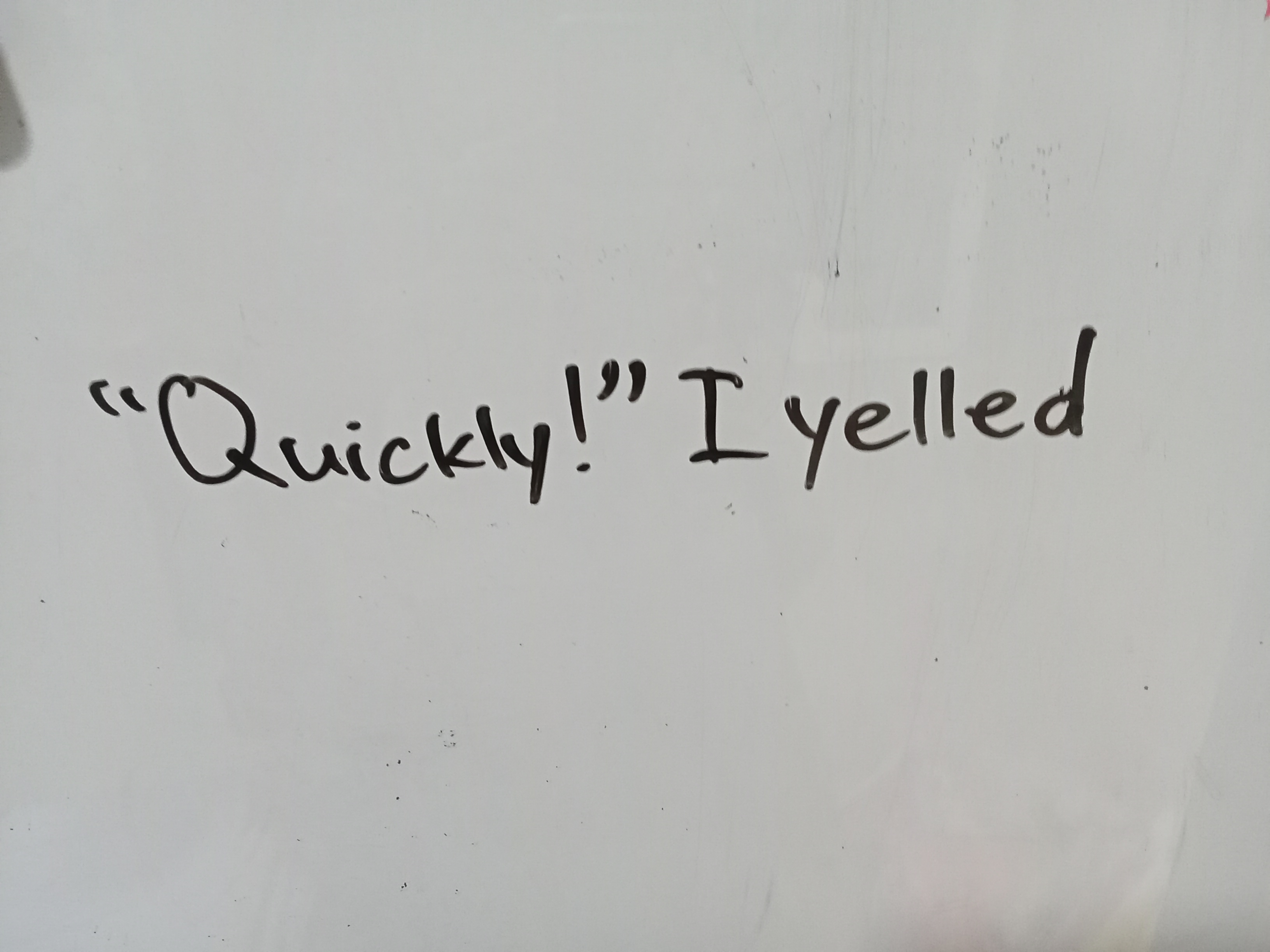 The handwriting exhibits a clear, bold style with rounded letter forms, as seen in the "Q" and "y" of "Quickly! I yelled". The writing is somewhat inconsistent, especially in the size and spacing between words, and has a slight upward slant. The letter formations are relatively simple and legible, although there's a certain irregularity in the strokes, hinting at a blend of carefulness and haste.
