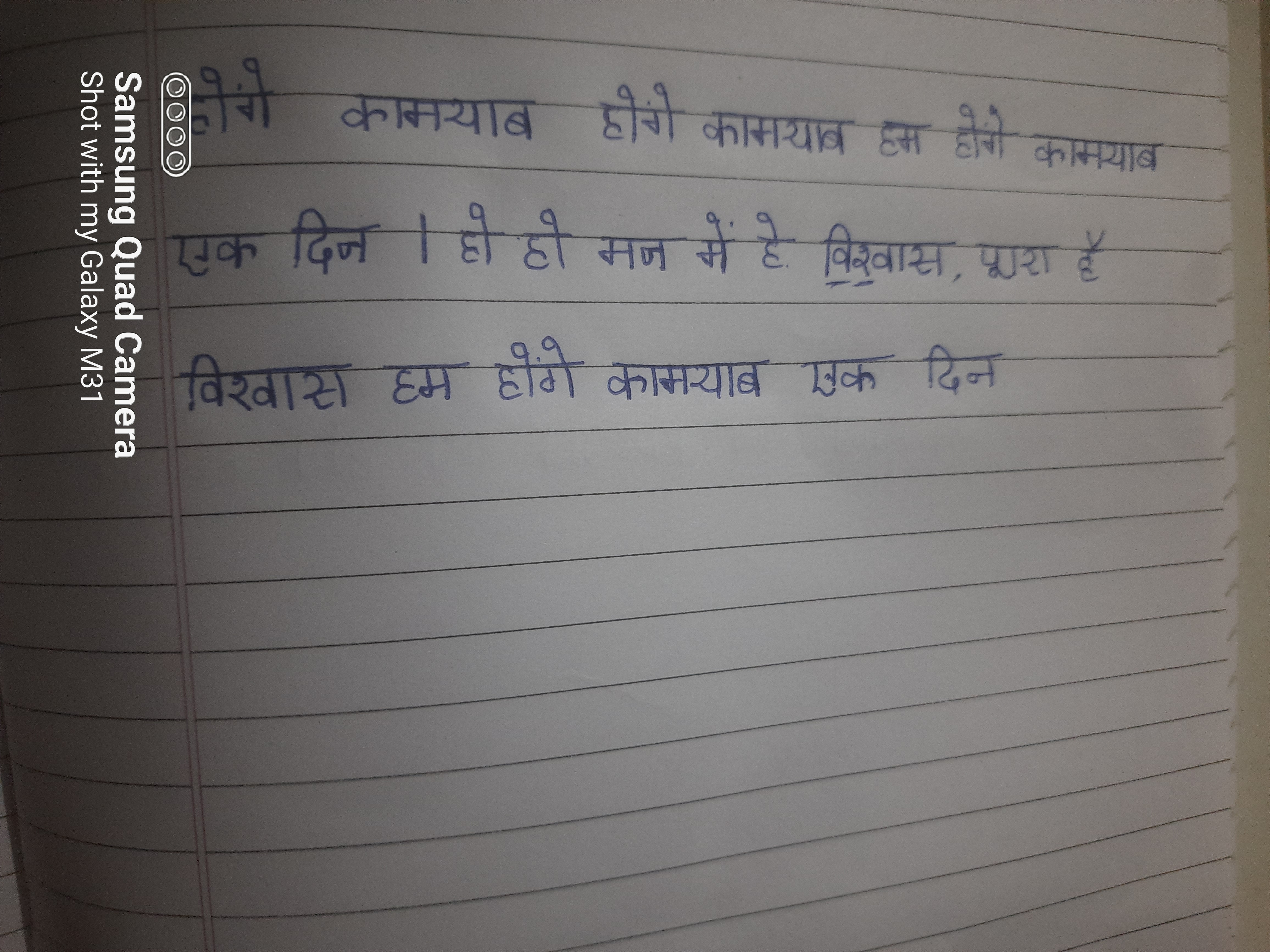 The handwriting presents a generally upright and simple style. The letters are well-formed and rounded, particularly visible in words like "कामयाब" and "विश्वास". There's a sense of consistency in the stroke width, which suggests a controlled hand. The spacing between words is moderate, lending to readability. Overall, the writing appears neat and legible, though with a touch of a childlike simplicity in some letter formations. The handwriting is influenced by Devanagari script, but adapted for quick and clear communication.