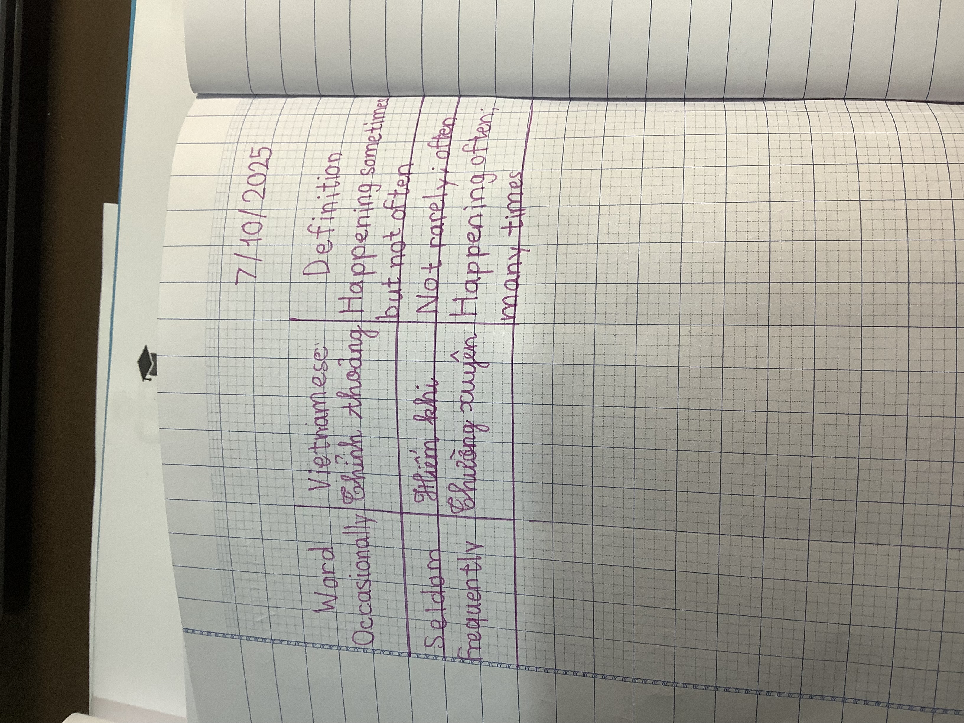 The handwriting is characterized by a clear, upright style with consistent letter formation, especially evident in words like "Definition" and "Occasionally". The writing maintains a fairly uniform size and spacing, lending it a structured appearance, aided by the use of graph paper. While neat, the strokes are somewhat deliberate, suggesting a careful rather than spontaneous hand.
