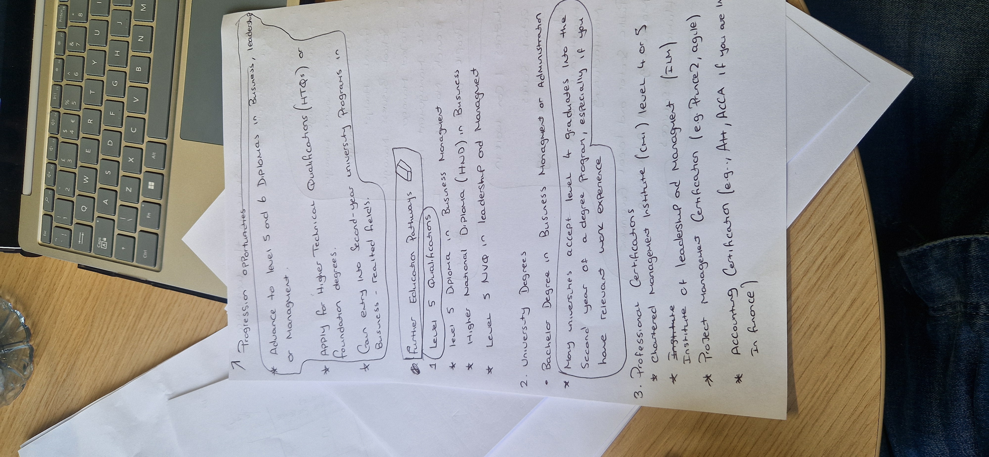 The handwriting exhibits a practical and organized style, clearly focused on conveying information efficiently. The letterforms are generally upright with a slight slant, suggesting a balance between assertiveness and adaptability. Notice the consistent spacing between words and lines, as seen in the sections outlining "Further Education Pathways" and "University Degrees", indicating a methodical approach to planning and execution.