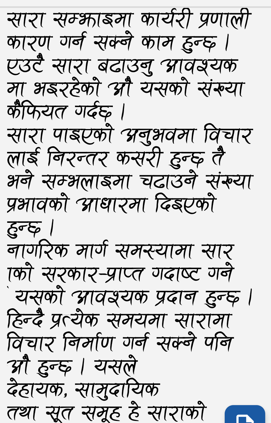 The handwriting exhibits a distinct and consistent style. The letter forms are well-defined and evenly spaced, as seen in phrases like "सारा सम्झाइमा" and "कारण गर्न सक्ने". There is a certain roundedness to the characters, contributing to an overall sense of harmony. The writing maintains a consistent slant and baseline, indicating a steady hand and focused mind. The script is relatively neat, and although there are variations in stroke thickness, the writing remains clear and readable.
