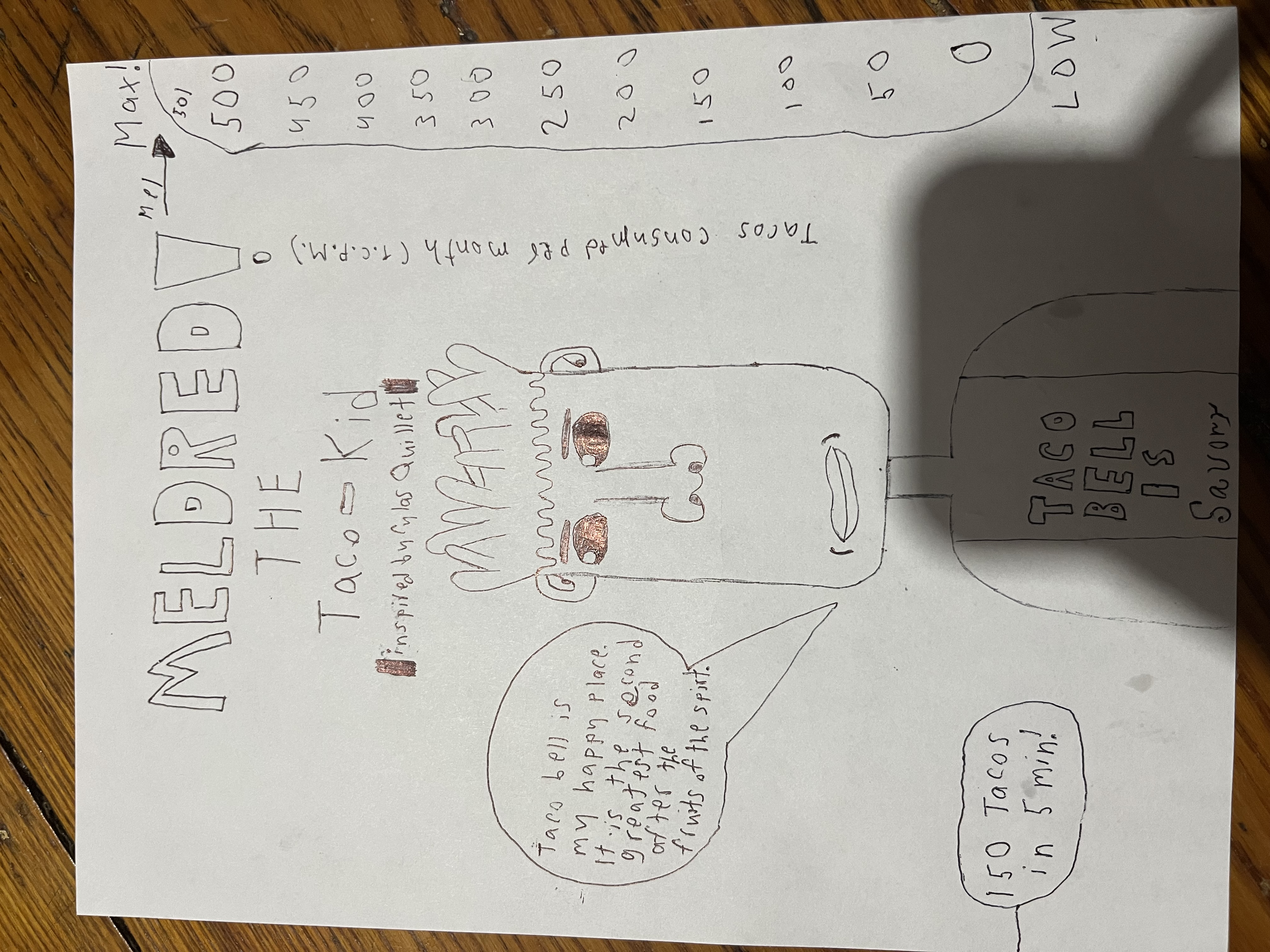 The handwriting sample displays a mixed style, featuring both printed block capitals, as seen in "MELDRED", and cursive elements, most evident in the handwritten notes like "Taco bell is my happy place". The writing exhibits variability in letter size and spacing, suggesting a lack of strict adherence to conventional forms. There's an element of deliberate presentation in the capital letters, potentially indicating a desire for emphasis, while the cursive elements feel more relaxed and personal. Overall, the writing is legible but lacks a high degree of consistency. The word 'inspired' appears to be in a different style, perhaps written at a different time.