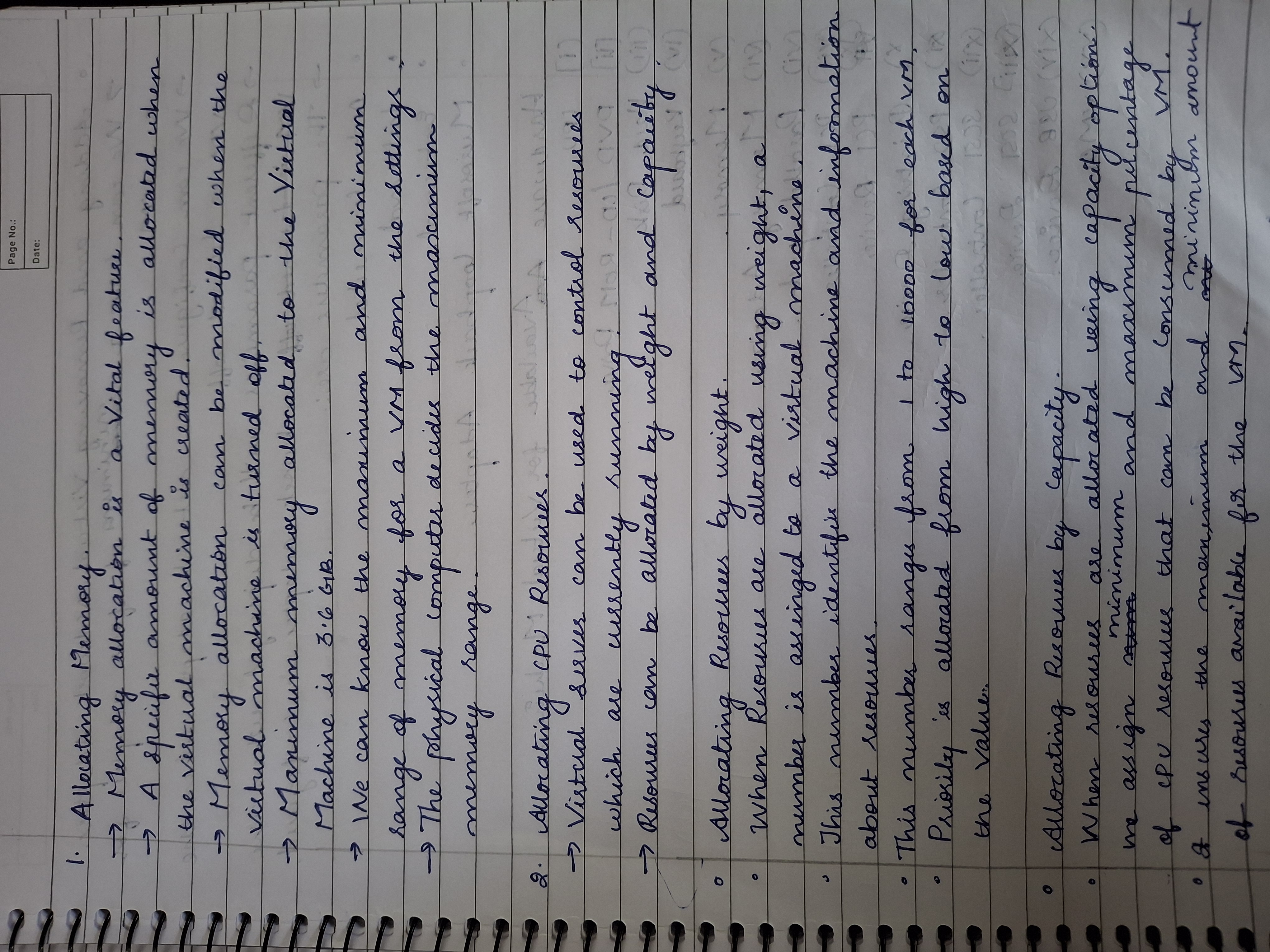 The handwriting is characterized by its clear, forward slant and connected letter formations, particularly evident in words like "allocating", "memory", and "virtual". The writing exhibits a consistent baseline and spacing, indicating a methodical approach. However, there's some variation in letter size and pressure, which introduces a degree of expressiveness. The use of arrows to delineate points suggests a structured thought process.