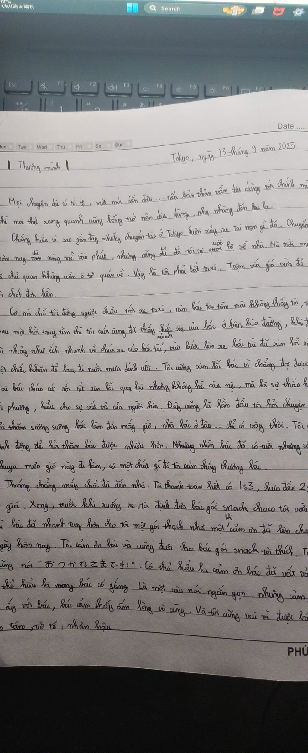 The handwriting exhibits a flowing, cursive style with slightly slanted characters. The strokes appear light and delicate, with rounded letter formations. Words like "Tokyo", "taxi" and "snack" demonstrate a certain flair. There is a moderate level of consistency throughout the sample, although the size and spacing of letters vary somewhat. The writing leans towards neatness but has a relaxed, informal quality.