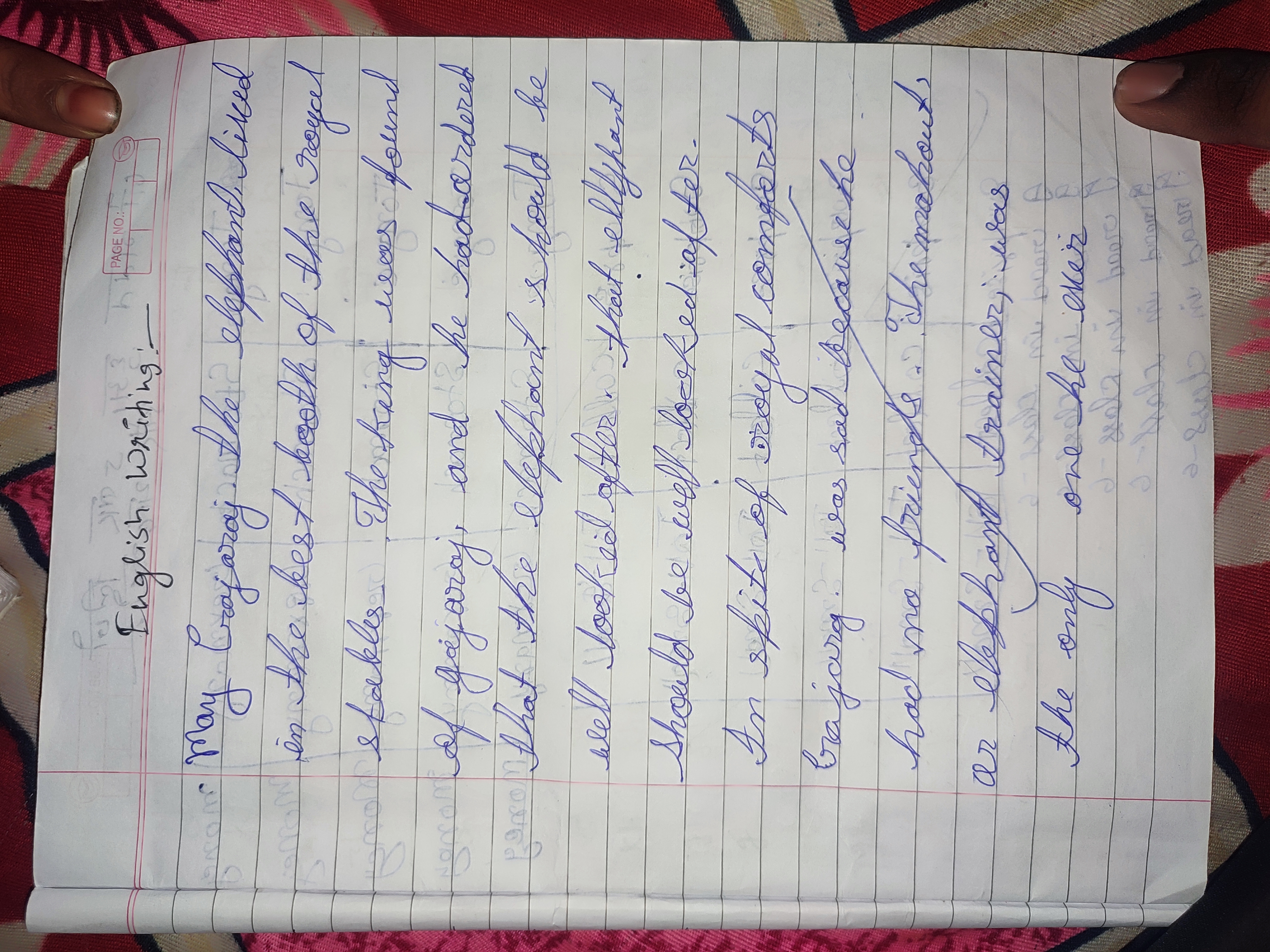 The handwriting is characterized by its cursive style with loops and rounded letterforms, evident in words like "elephant" and "royal." There's a noticeable slant to the right, suggesting a forward-moving energy. The letter sizes appear somewhat uniform, although the baseline wavers slightly, lending a touch of informality. Spacing between words is generally consistent, although there are some inconsistencies between the words. The pressure seems consistent throughout the sample. Overall, the handwriting leans towards legibility but could benefit from greater precision.