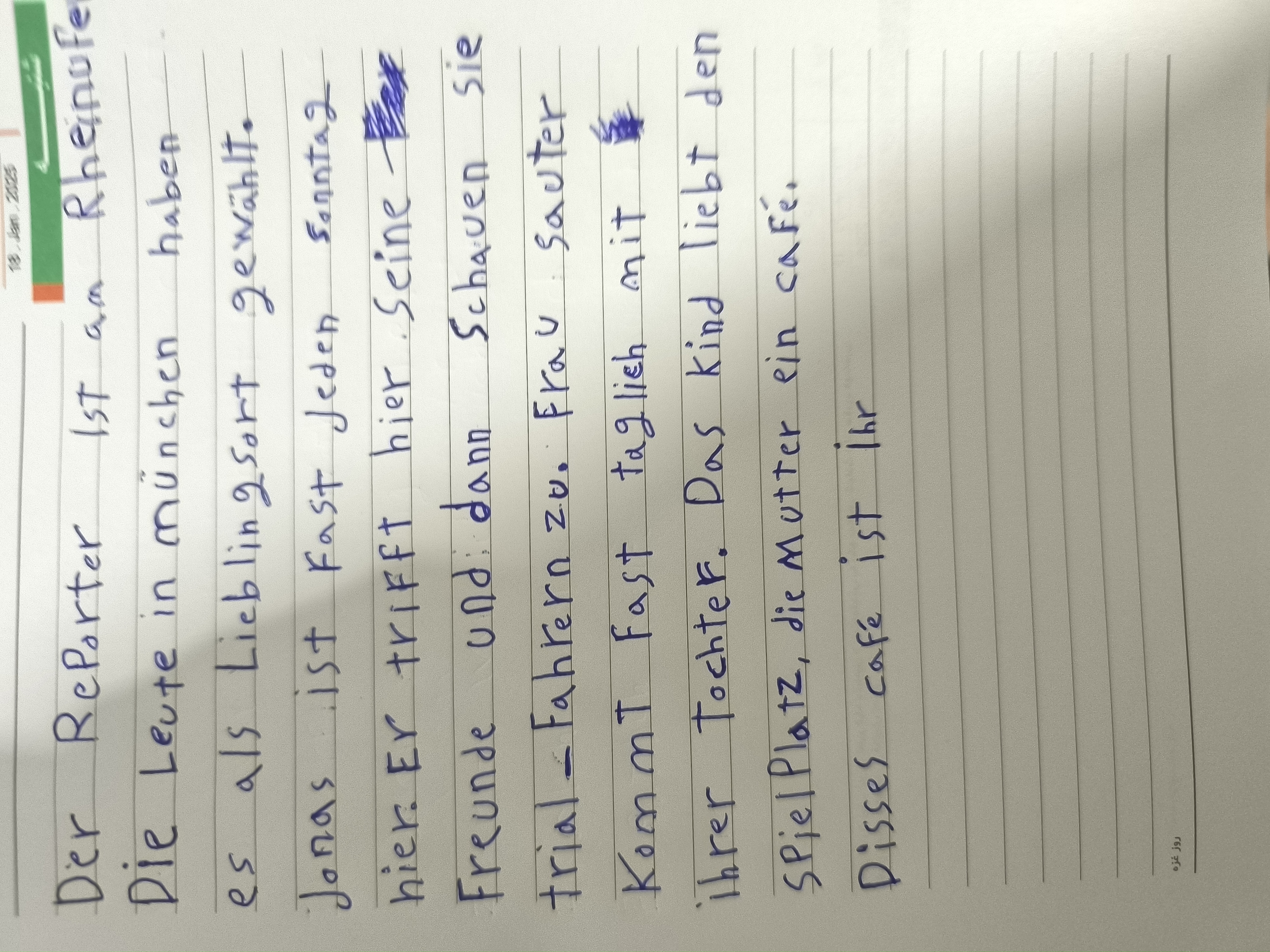 The handwriting sample presents a neat and legible style, executed with evident care. The script maintains a relatively consistent slant, with upright letters that contribute to its clarity. Notice the well-formed letters in words like "Reporter" and "Leute", demonstrating a good command of basic handwriting skills. The pressure applied is generally even, suggesting a steady hand and a controlled approach. However, some inconsistencies are noticeable in the spacing between words, which could benefit from greater uniformity.