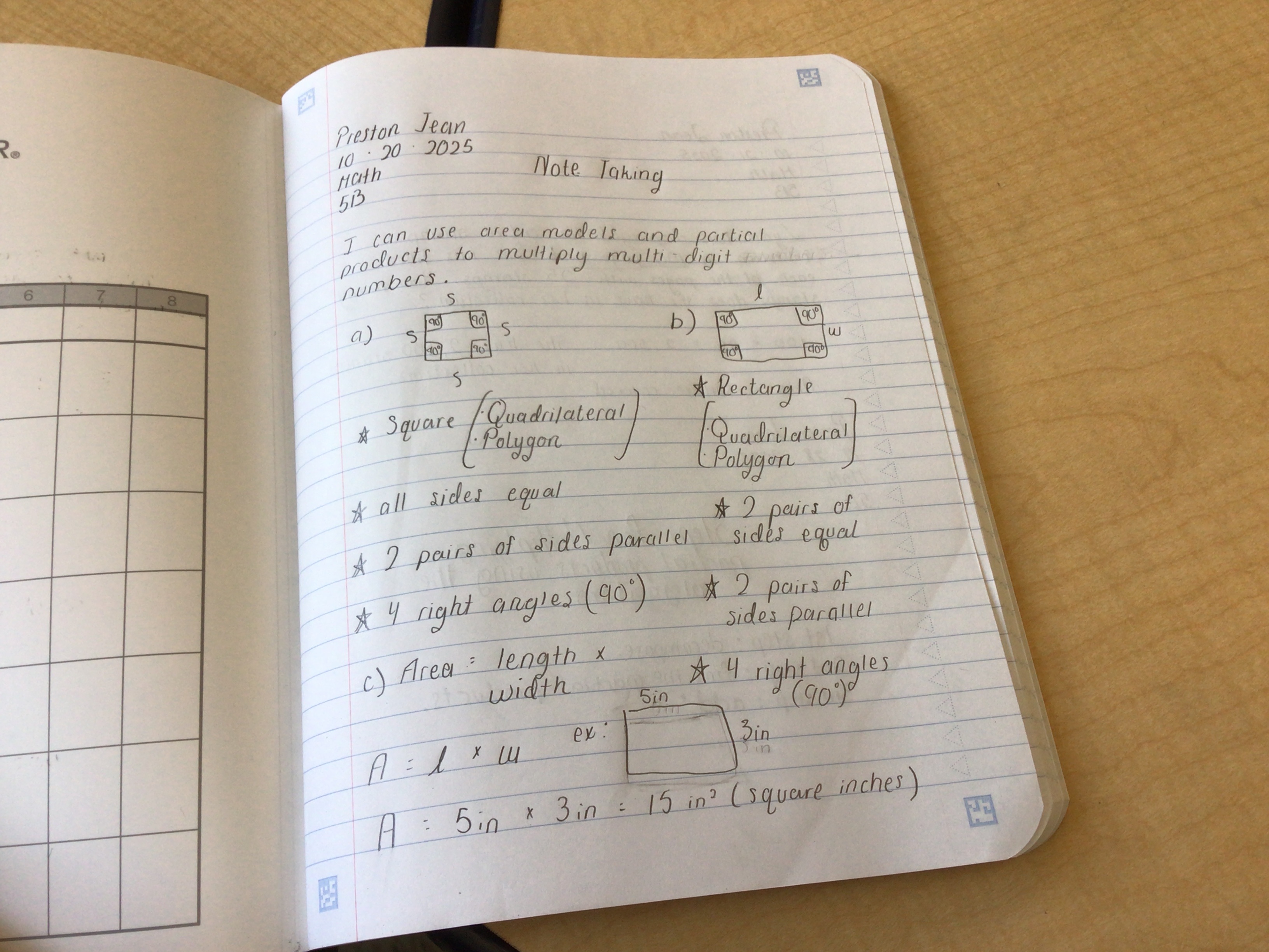 The handwriting is neat and quite legible, with a consistent slant to the right. The letter formations are generally well-rounded and even, as seen in the carefully drawn 'square' and 'rectangle' diagrams. There's a clear effort to maintain uniformity in letter size and spacing, contributing to an overall organized appearance. The handwriting displays a certain formality, evident in the distinct and deliberate strokes. The use of neat underlines and bullet points (stars) suggests attention to detail and structure.