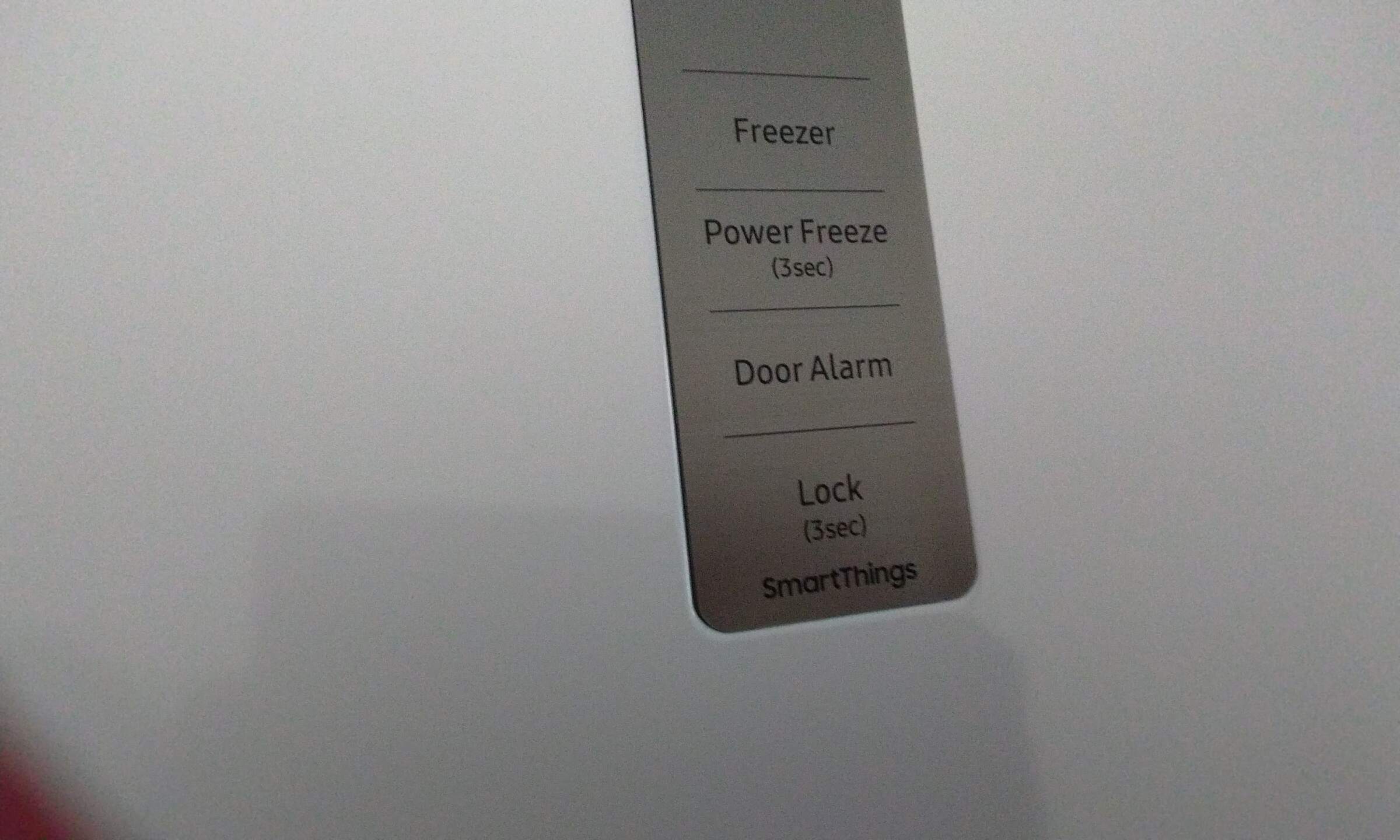 The handwriting in this sample presents a rather blocky, printed style, eschewing the loops and flourishes of cursive. The lettering is upright, showing no slant, and appears uniform in size and shape. Words such as "Freezer", "Power Freeze", "Door Alarm", "Lock", and "SmartThings" exhibit a clear, consistent presentation, suggesting a deliberate and methodical approach to writing. The spacing between letters and words seems ample, contributing to the overall legibility of the text.