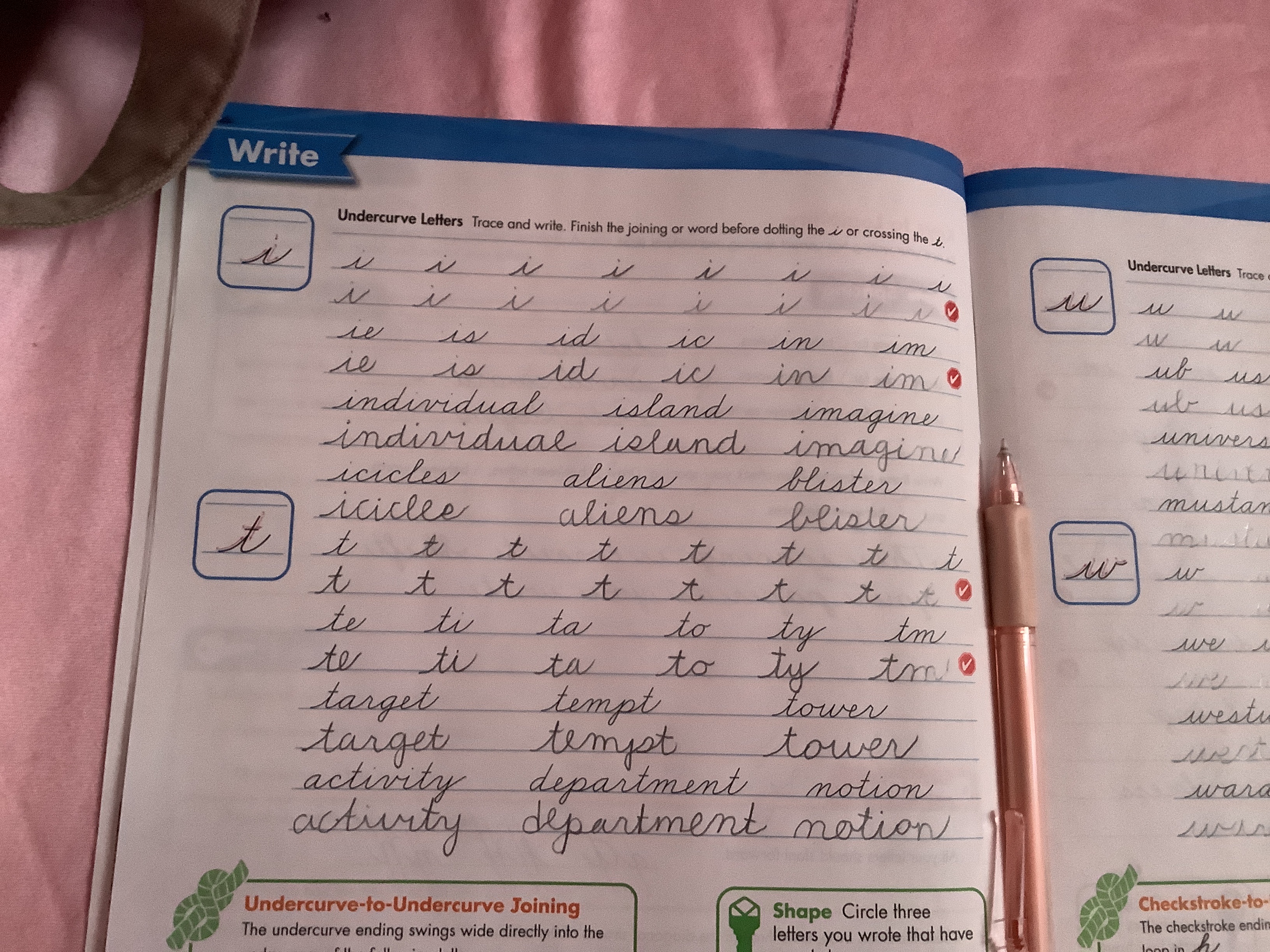 The handwriting sample presents a neat and uniform style, reminiscent of a student diligently practicing their penmanship. The letters are carefully formed, with consistent undercurves, particularly noticeable in letters like 'i', 't', and 'u'. The spacing between letters and words is generally consistent, contributing to the overall legibility. There is an obvious attempt to adhere to a prescribed style, as indicated by the textbook's instructions.
