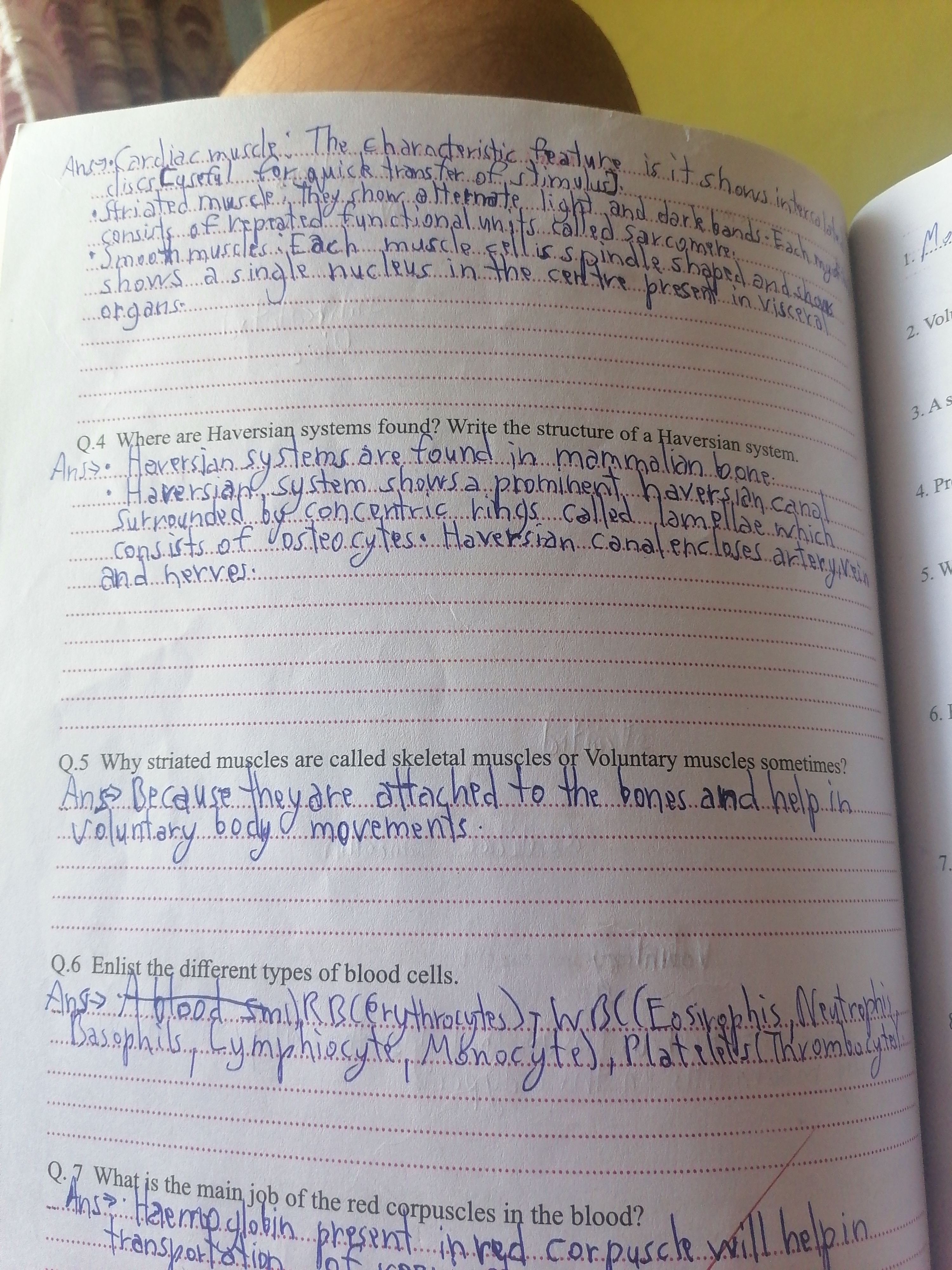 The handwriting is generally upright with a slight slant, suggesting a blend of objectivity and some emotional expression. The letter formations are mostly rounded, but there's also some angularity present, indicating a mix of adaptability and assertiveness. The baseline wavers slightly, which might reflect some variability in mood or energy levels. Words like "Haversian" and "corpuscles" are written with a heavier stroke, which suggests confidence in subject knowledge.