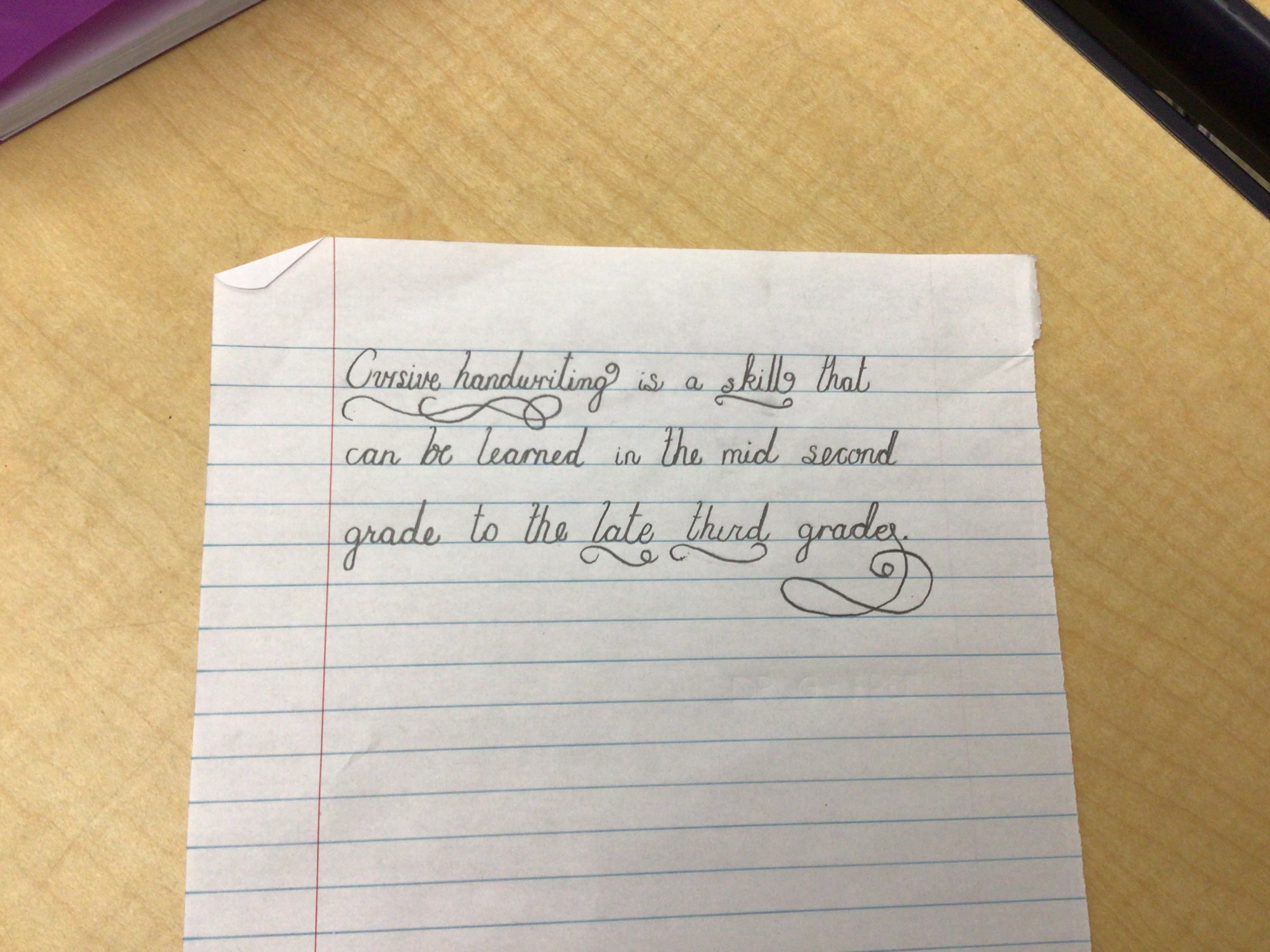 The handwriting style presented is a carefully crafted cursive, showcasing delicate loops and flourishes. Words flow with an air of practiced elegance, with specific letter formations exhibiting a refined touch. Note the ornamental details on the 'C' in 'Cursive', the 'g' in 'handwriting', the 's' in 'skills' and the 't' in 'that', and the 'l' in 'late', and the embellishment at the end of the sample, all adding to its distinctive appearance. The consistency is relatively high, maintaining a uniform slant and size across the sample, although some letters show minor variations. Overall, it appears neat and quite legible.