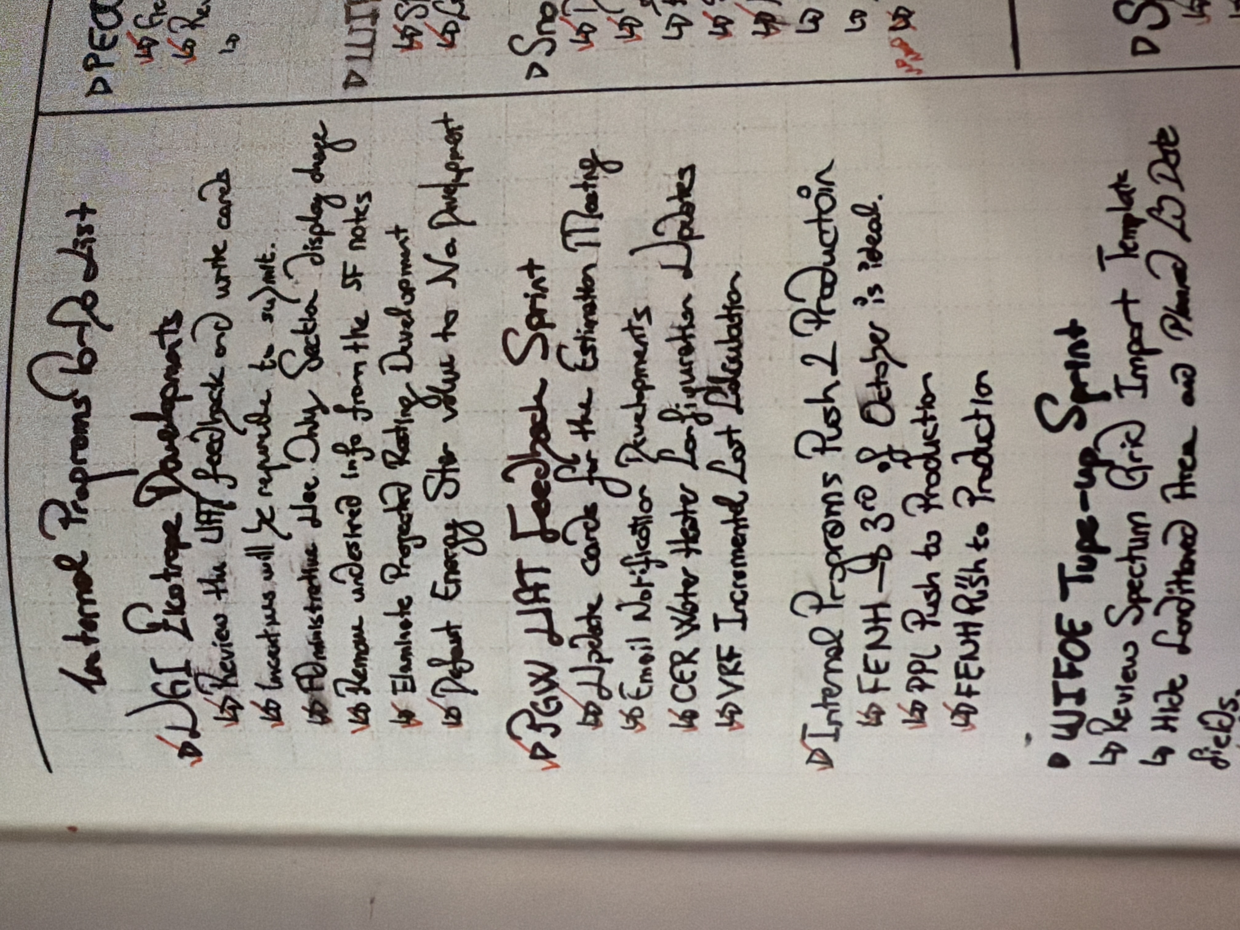 Your handwriting style leans towards a deliberate and methodical approach, visible in the consistent letter formations and spacing, as seen in phrases like "Internal Programs" and "UAT Feedback". The downstrokes are firm, and the letters tend to be rounded, suggesting a desire for clarity and organization. The writing appears to be carefully planned, which could indicate a preference for structure in your daily tasks. The frequent use of lists and bullet points reinforces this inclination towards order.