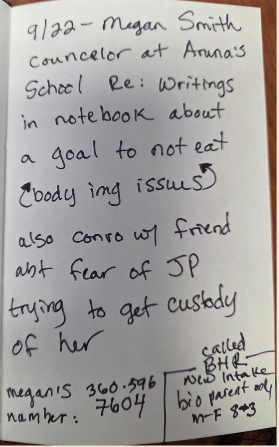 The handwriting exhibits a blend of practicality and conscientiousness. The writing is mostly upright, with a slight slant. Letter formations are simple and clear, as can be seen in words like "Megan Smith", and "counselor". There is an economy of movement, with some letters being abbreviated, such as 'abt' for about. The overall impression is of someone who prioritizes clarity and directness.