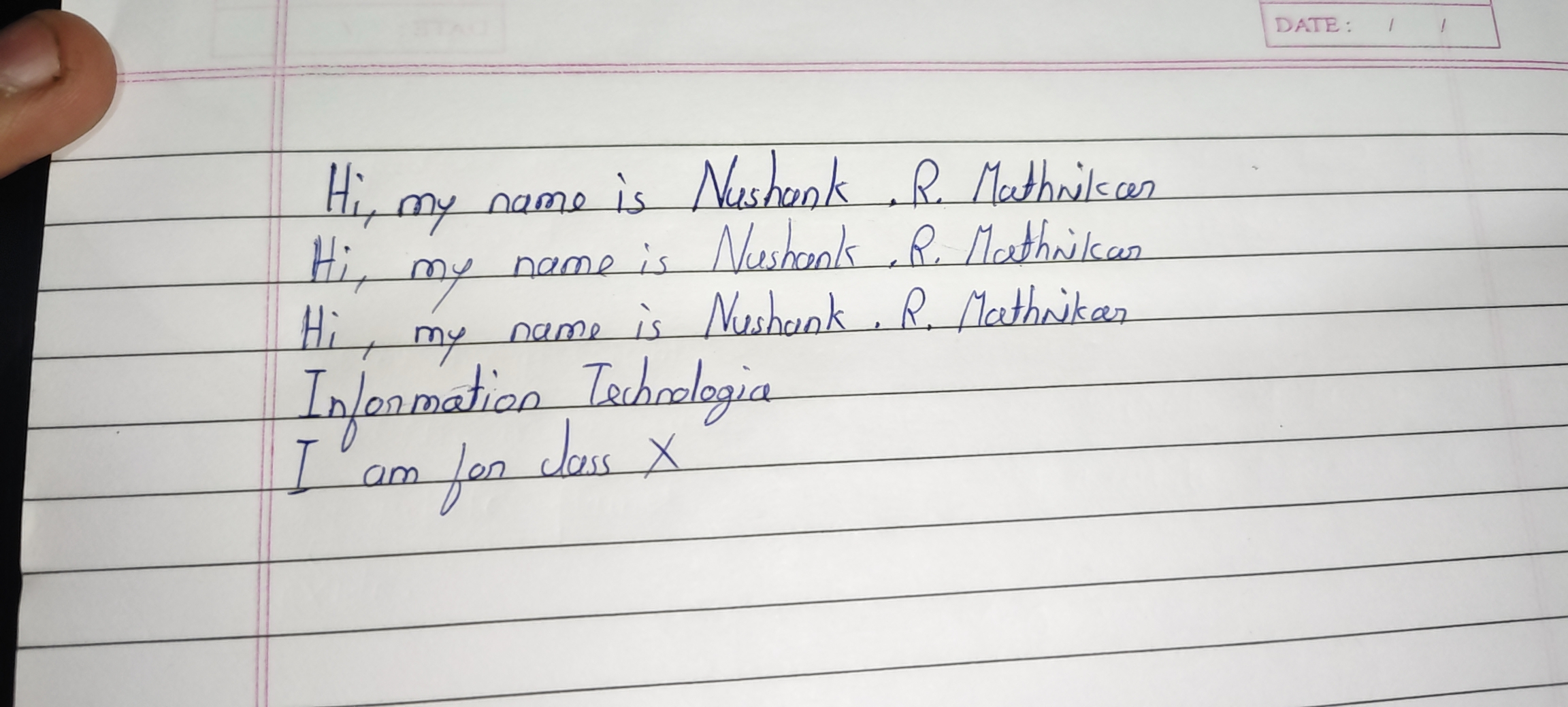 This handwriting displays a generally neat and upright style, as seen in the consistent baseline and even spacing. The letter formations are mostly legible, with rounded shapes that suggest a careful and deliberate approach. The size is moderate, neither excessively large nor cramped, indicating a balanced use of space. The repetition of "Hi, my name is Nushank" suggests a practice exercise, with slight variations in the 'R' and other letters hinting at natural handwriting quirks.