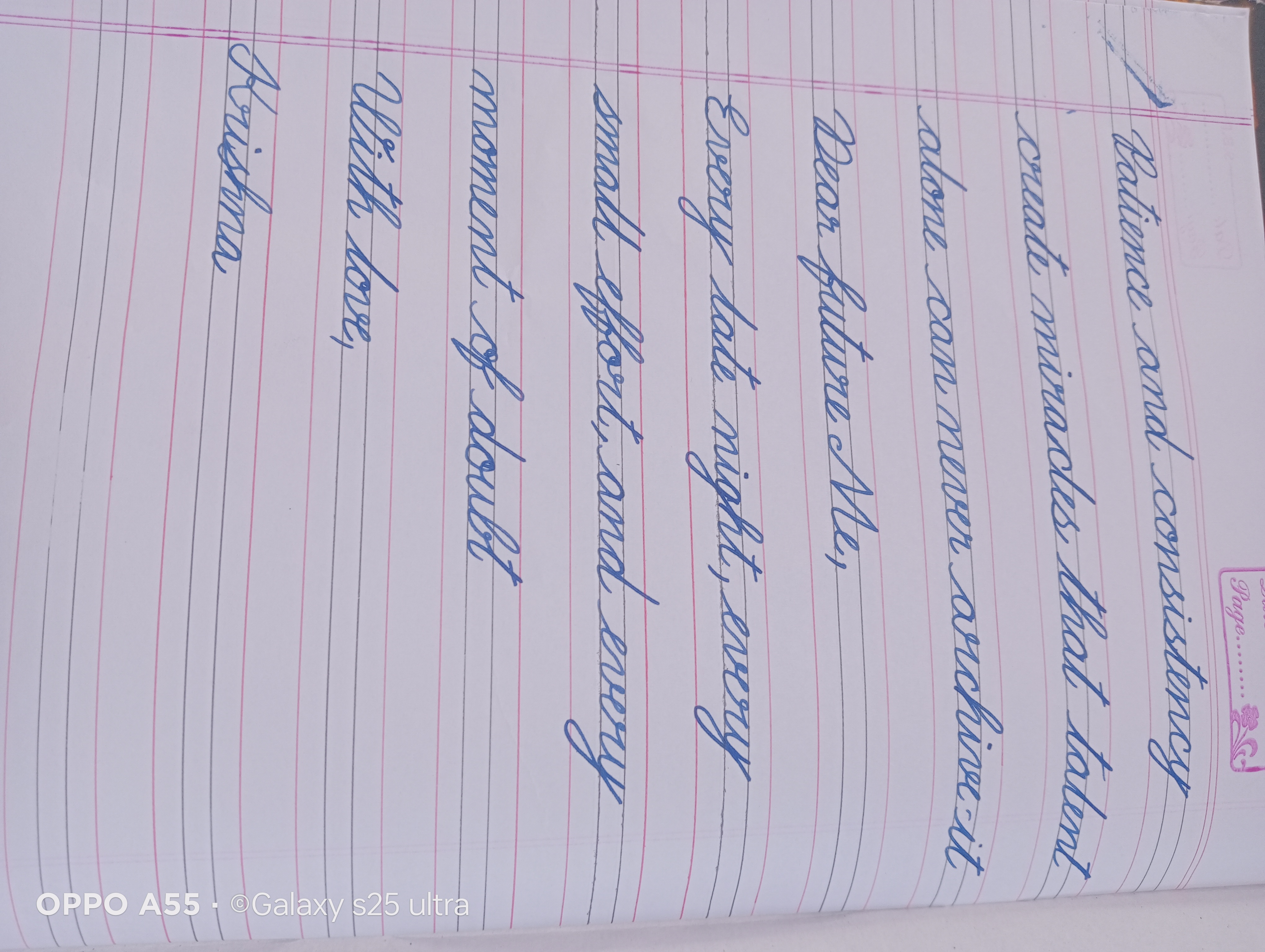 Based on this sample, the writer likely possesses a patient and persistent nature, echoing the opening sentiment, "Patience and consistency create miracles." The attention to detail and well-formed letters hint at a conscientious individual who values clarity and precision in communication. The forward slant implies optimism and a proactive approach to life's challenges, with a willingness to embrace the future as addressed in "Dear future Me."