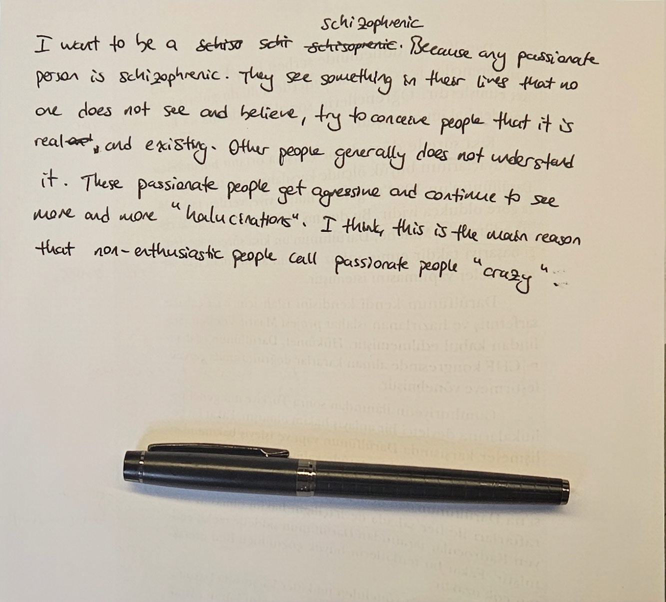 Based on the handwriting, one might infer a personality that is intellectually curious, passionate, and perhaps somewhat unconventional. The writer appears to be someone who is deeply engaged with their own thoughts and experiences, and who may struggle to reconcile their inner world with external reality. The tendency to repeat words and phrases suggests a mind that is wrestling with complex ideas, seeking to clarify and reinforce them. There's a sense of someone who values authenticity and may bristle at perceived misunderstandings or judgments from others.