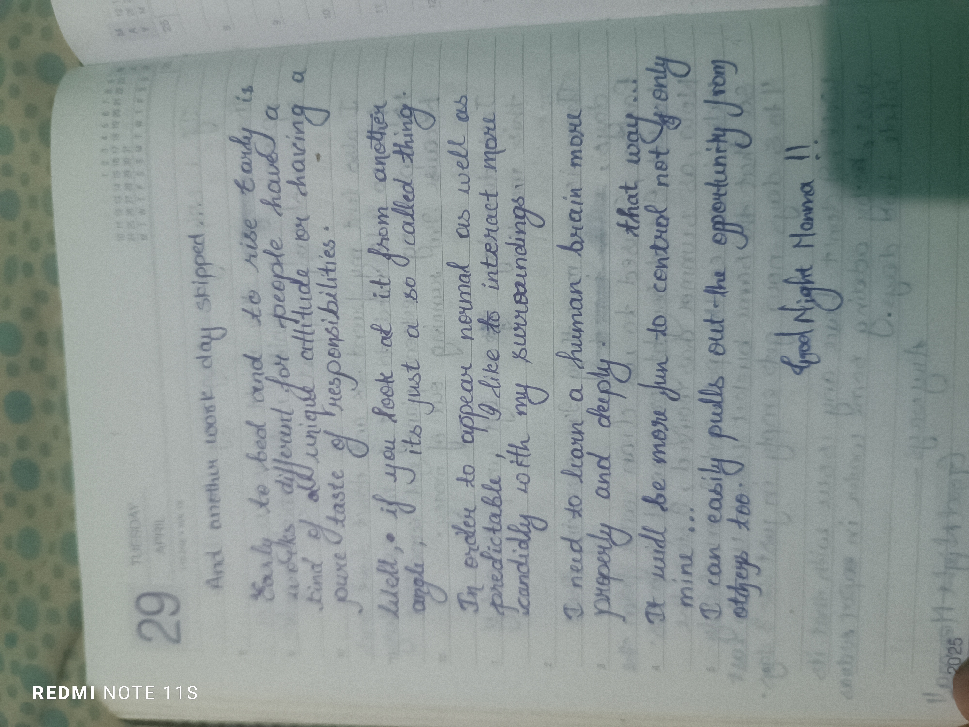 Based on the handwriting, it seems you are a person who values individuality and self-expression. The slight slant and rounded letters imply a warm and approachable nature, while the varying baseline might indicate a spontaneous and adaptable spirit. There's a sense of intellectual curiosity evident in the formation of the letters, as if each word is crafted with careful consideration.