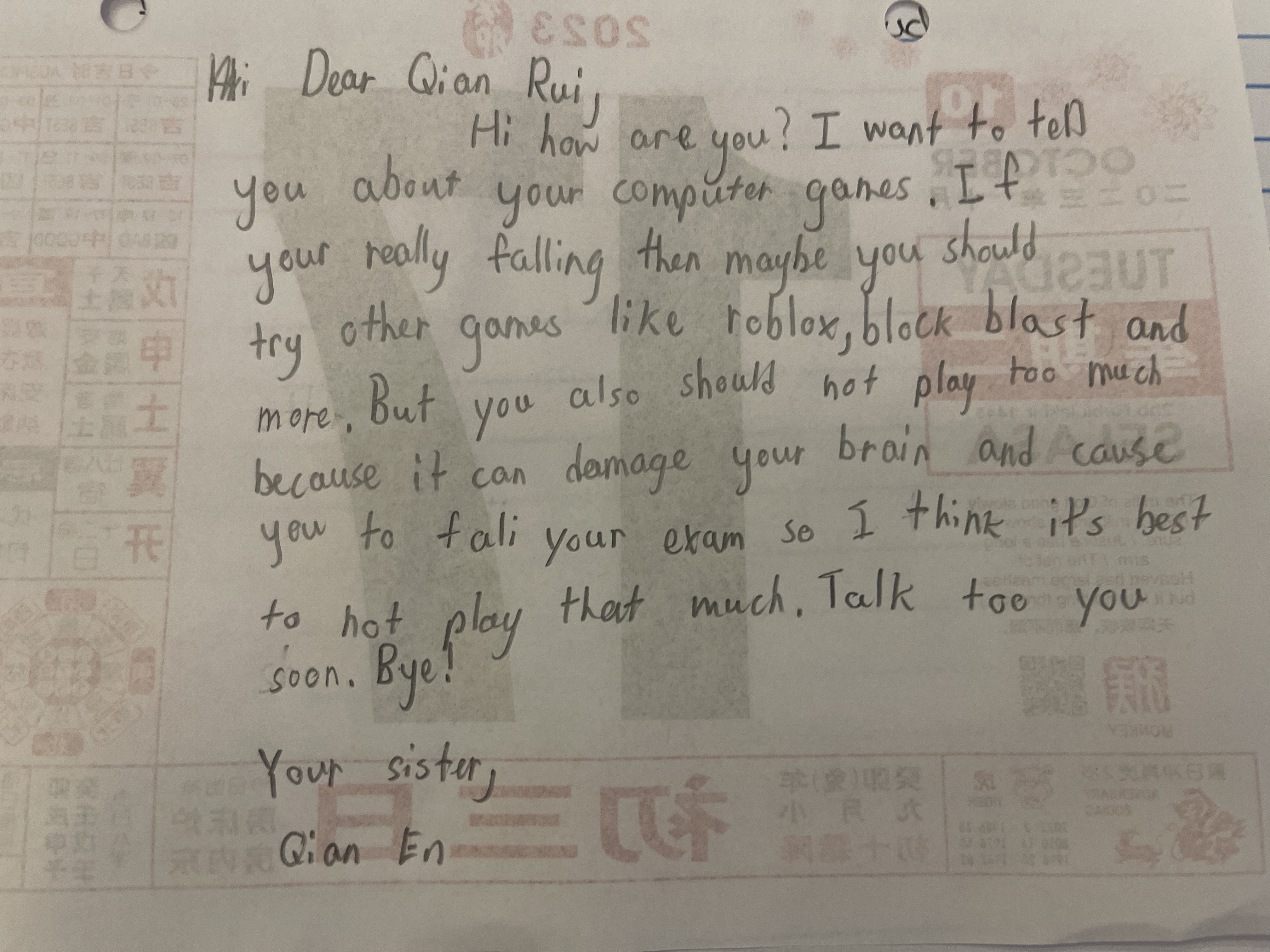 Based on this handwriting, the writer appears to be someone who is caring and possibly a bit of a worrier. The clear and simple letter formation suggests a straightforward and honest personality. The gentle roundedness hints at someone who is approachable and kind, with a nurturing nature. The advice about computer games implies a responsible and thoughtful individual.