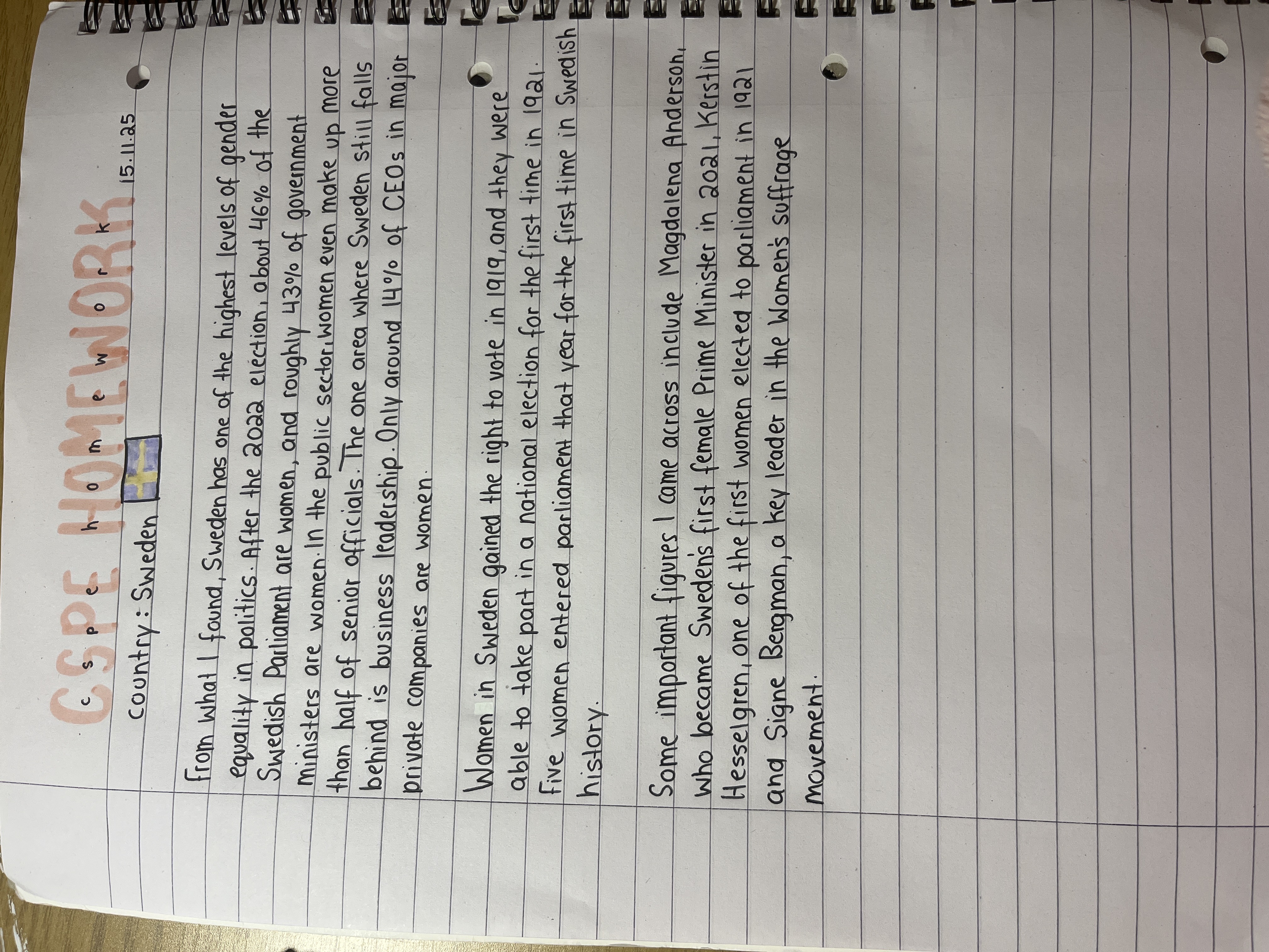 The handwriting is characterized by its upright stance and rounded letter forms, evident in words like "Sweden" and "women". The script maintains a consistent size and spacing, contributing to overall legibility. There's a slight heaviness to the strokes, suggesting a deliberate and careful approach to writing. The baseline is generally followed, although there are slight deviations. The writing style appears neat and well-organized, filling the page efficiently.