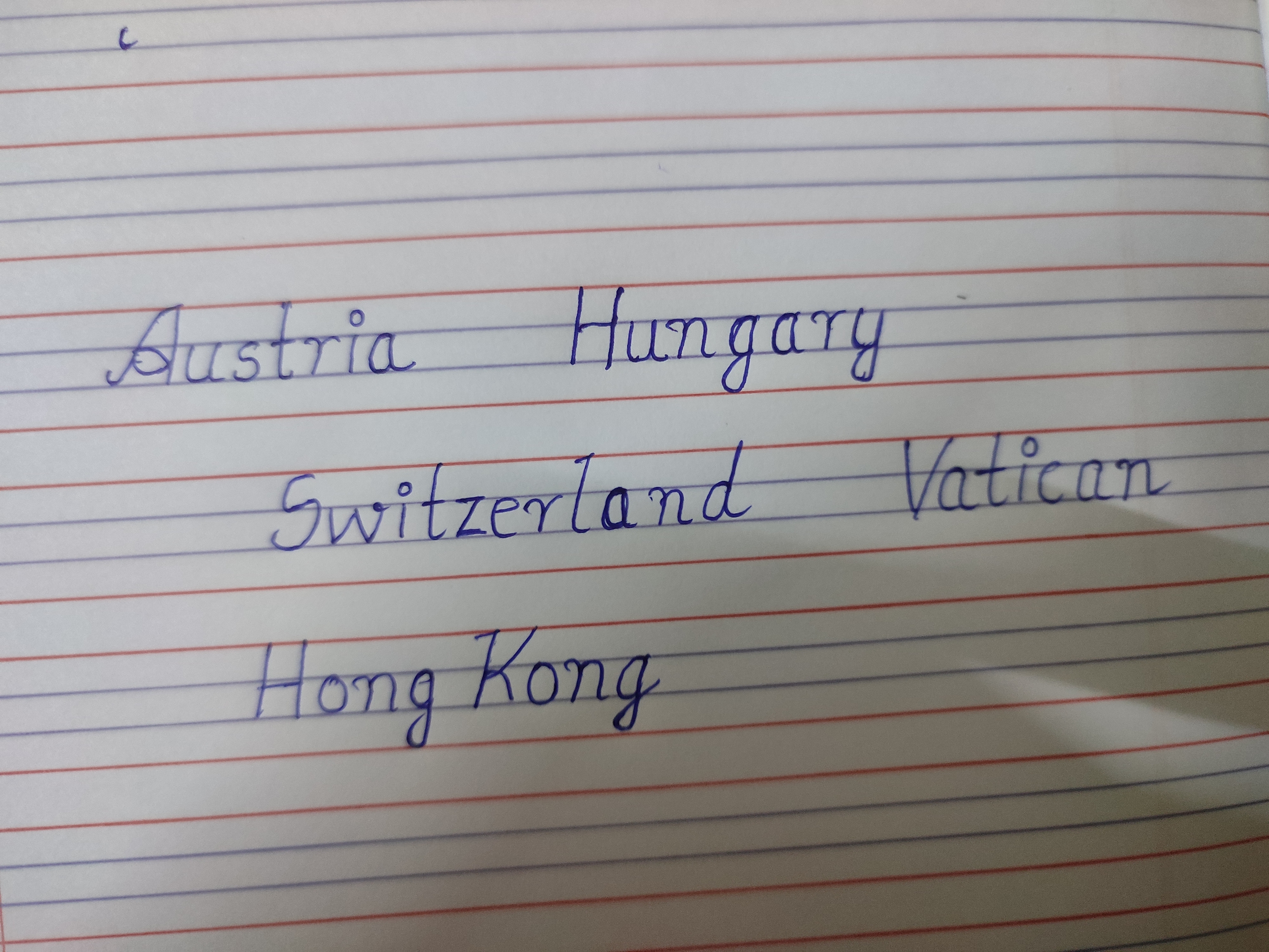 This handwriting leans towards a connected script, where letters within words often flow into each other. The overall appearance is neat and generally legible, with rounded letterforms like in "Austria" and "Hungary" giving it a soft and approachable quality. The strokes appear deliberate, but the consistency could be improved; some letters vary slightly in size and form across the sample. The 'S' in "Switzerland" is very stylized, while the rest of the word has a more conventional appearance. The writing exhibits a gentle slant, suggesting a controlled but not overly rigid hand.