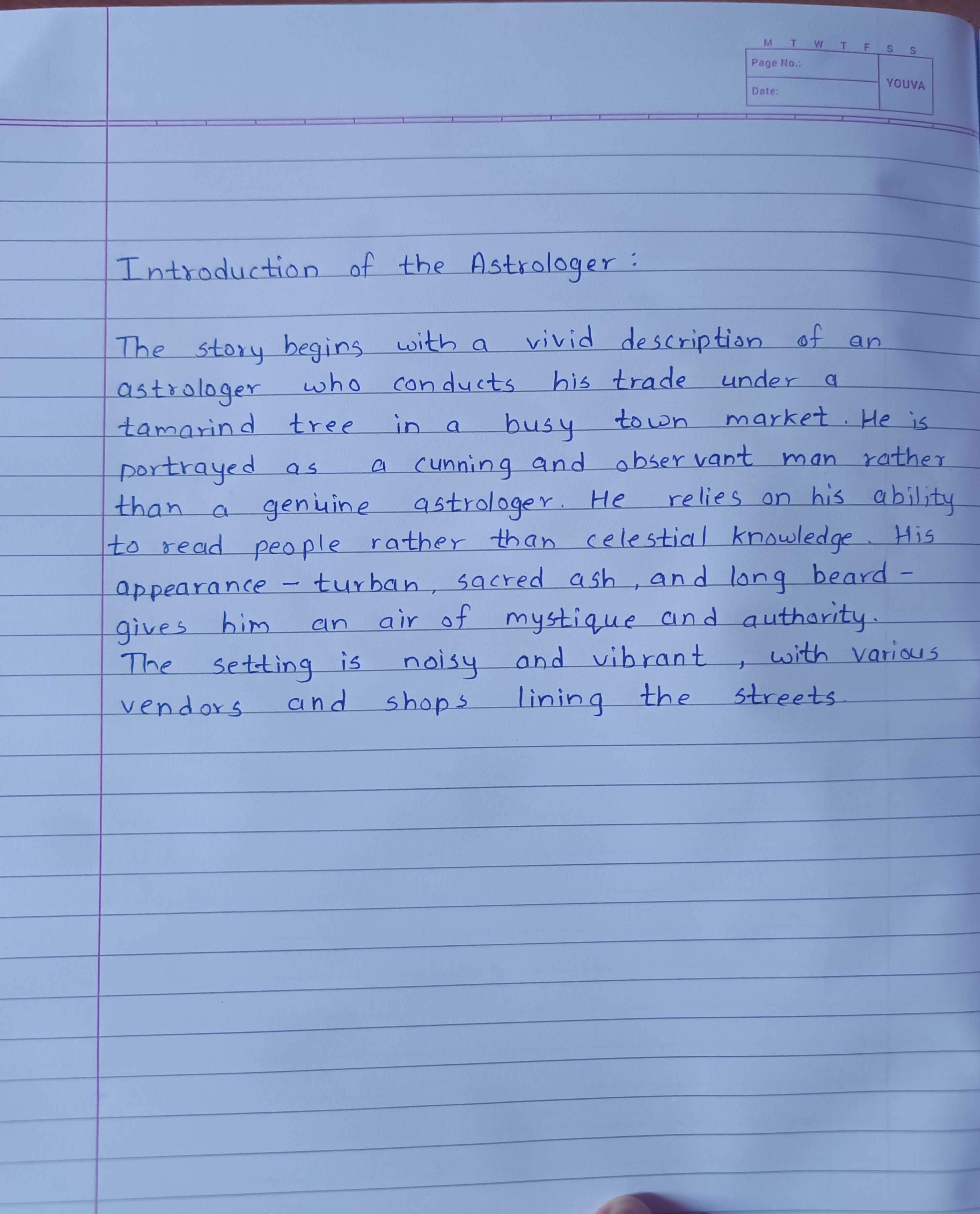 The handwriting style is upright and relatively neat, with a consistent slant and letter formation throughout the sample. The spacing between words is generally good, contributing to legibility. There's a clear distinction between uppercase and lowercase letters, such as in the words "Introduction" and "Astrologer". The writing follows the lines accurately, showing good control. However, some letters, like the 'g' in "astrologer" and "genuine", appear somewhat angular, lacking a smoother curve.