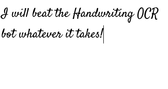 The handwriting exhibits a cursive style, with loops and connections between letters. The writing is quite bold and has a definite slant, which adds to its dramatic flair. The size of the letters appears to be consistent throughout the sample, suggesting a degree of control and practice. The phrases "beat the Handwriting OCR bot whatever it takes!" flow together smoothly, although there's a certain stiffness to the overall appearance.