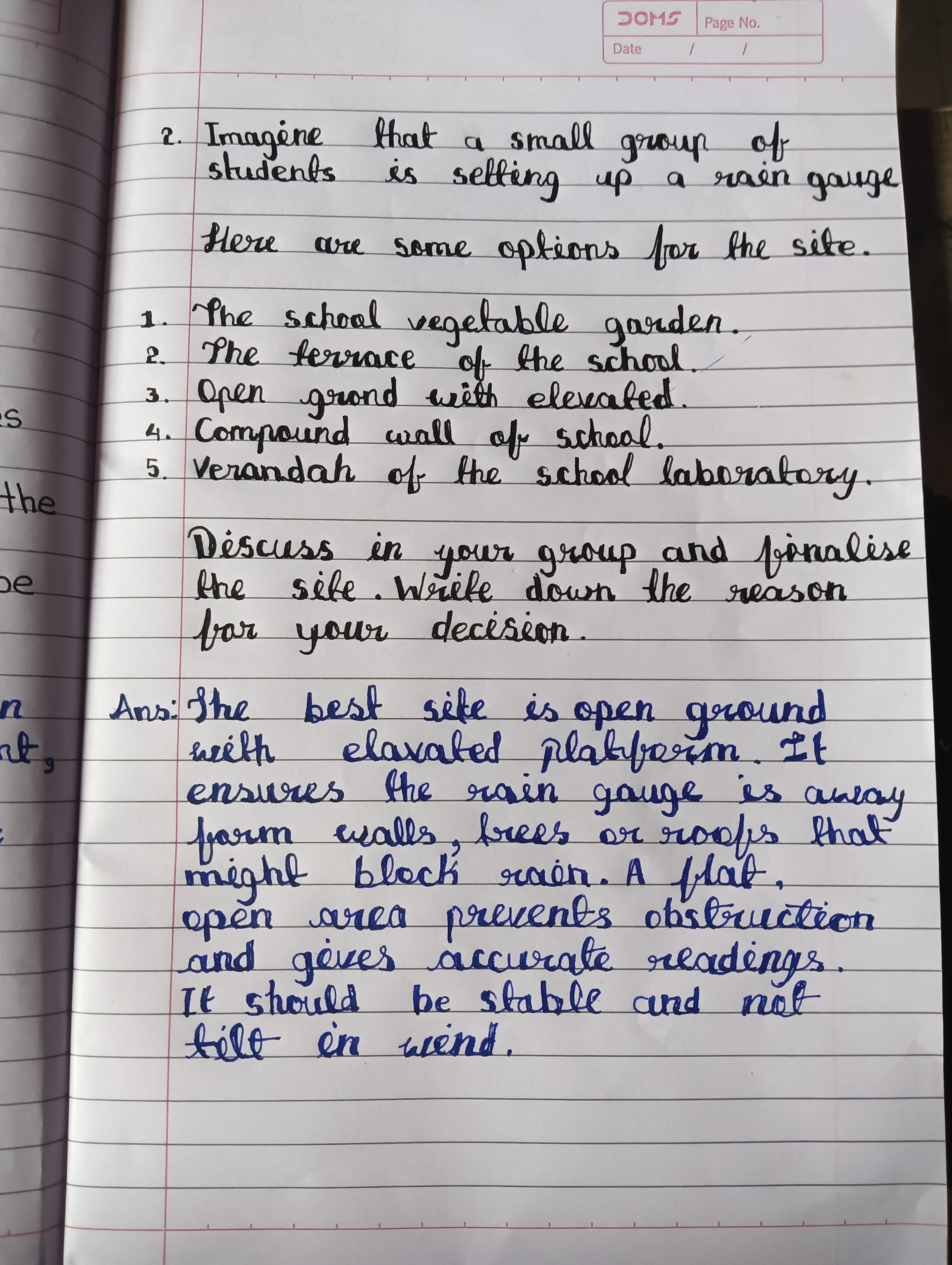 The handwriting style presents a rounded, flowing script with a consistent slant. Letters are generally well-formed, though there are instances where certain characters, such as the 'a' and 'e', tend to close up slightly. The spacing between words is generally good, enhancing legibility. The handwriting maintains a relatively uniform size, contributing to its neat appearance. Overall, the writing demonstrates a steady hand and controlled execution, evident in phrases like "setting up a rain gauge" and "accurate readings".