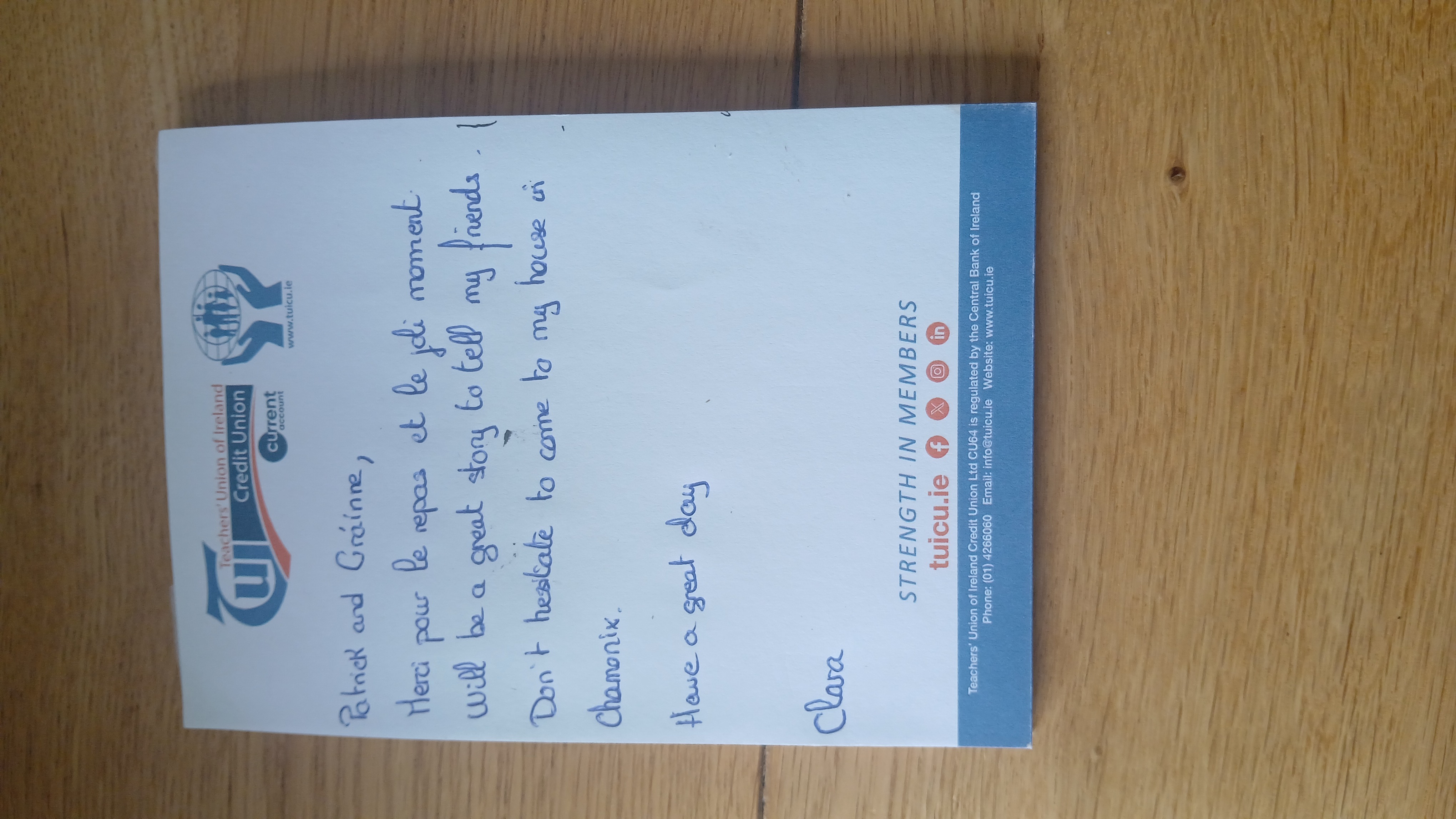 To further enhance the handwriting, focus on maintaining consistent letter sizing and spacing, especially in words where some letters are taller than others, like in "Patrick and GrΓ‘inne". Paying a little more attention to the baseline can also make the writing appear more grounded and stable. Experimenting with different pen grips or writing angles might help to find a more comfortable and sustainable style over longer periods of writing.