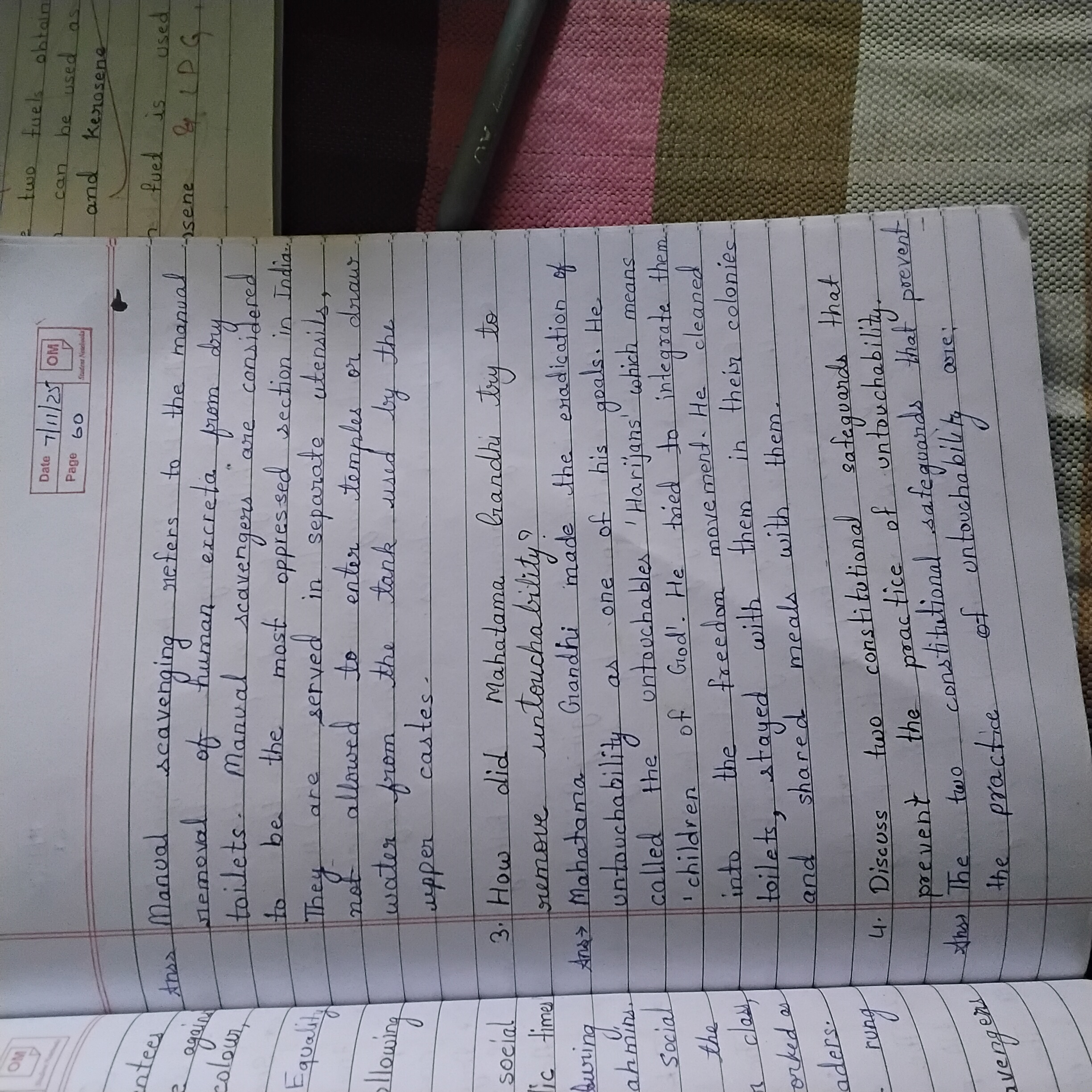 The handwriting is generally neat and legible, showing a clear attempt at precision. The letters are well-formed, and there is a consistent slant to the right. The spacing between words is adequate, although the spacing between letters within words could be more uniform. The overall impression is of careful and considered writing, as evidenced in phrases like 'manual scavengers' and 'constitutional safeguards'.