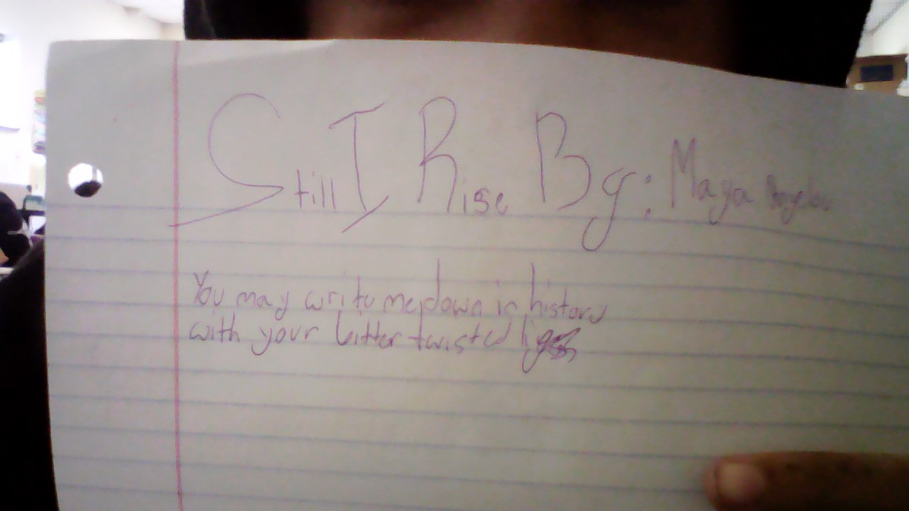 The handwriting style presents a blend of deliberate strokes and a carefree attitude. The initial large lettering of 'Still I Rise' contrasts with the smaller, more compact cursive used for 'You may write me down in history'. There is a tendency towards rounded letterforms, especially noticeable in the 'o's and 'g's, giving the writing a soft, approachable feel. The slant is generally consistent, indicating a balanced emotional expression. However, there is also a degree of variability in letter size and spacing, which hints at spontaneity.