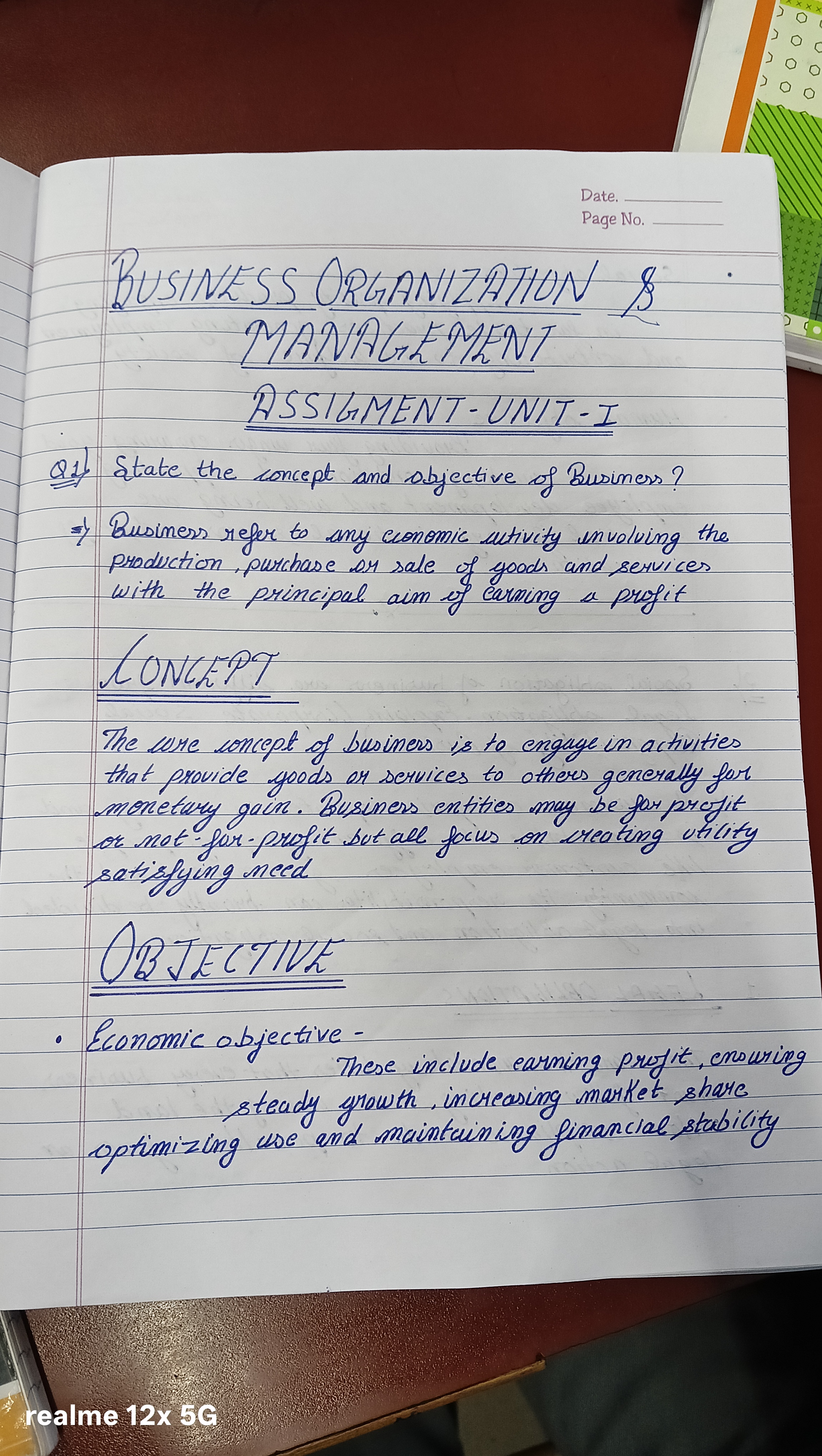 The handwriting in this sample exhibits a consistent forward slant, suggesting a proactive and engaged approach. The letter formation is generally neat and legible, with a clear distinction between individual letters, such as in the words "Business Organization" and "Management", which indicates a structured and organized mindset. The spacing between words is consistent, promoting readability. However, there are occasional inconsistencies in letter size, with some letters appearing larger than others. The pressure applied seems moderate, implying a balanced approach to expression.