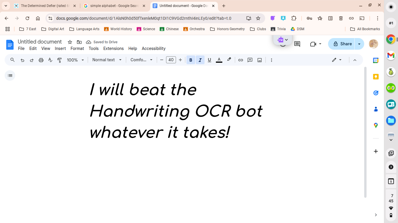 The handwriting style is characterized by its bold and upright stance, evident in phrases like "I will beat the Handwriting OCR bot". The letters are large and well-spaced, exhibiting a certain level of neatness and legibility, though perhaps lacking in subtle flourishes or personalized touches. The slant is generally consistent, contributing to an overall impression of stability and directness. There is a clear emphasis on clarity and straightforward communication, rather than artistic expression. The choice of words further enhances this impression of determination and a no-nonsense attitude.