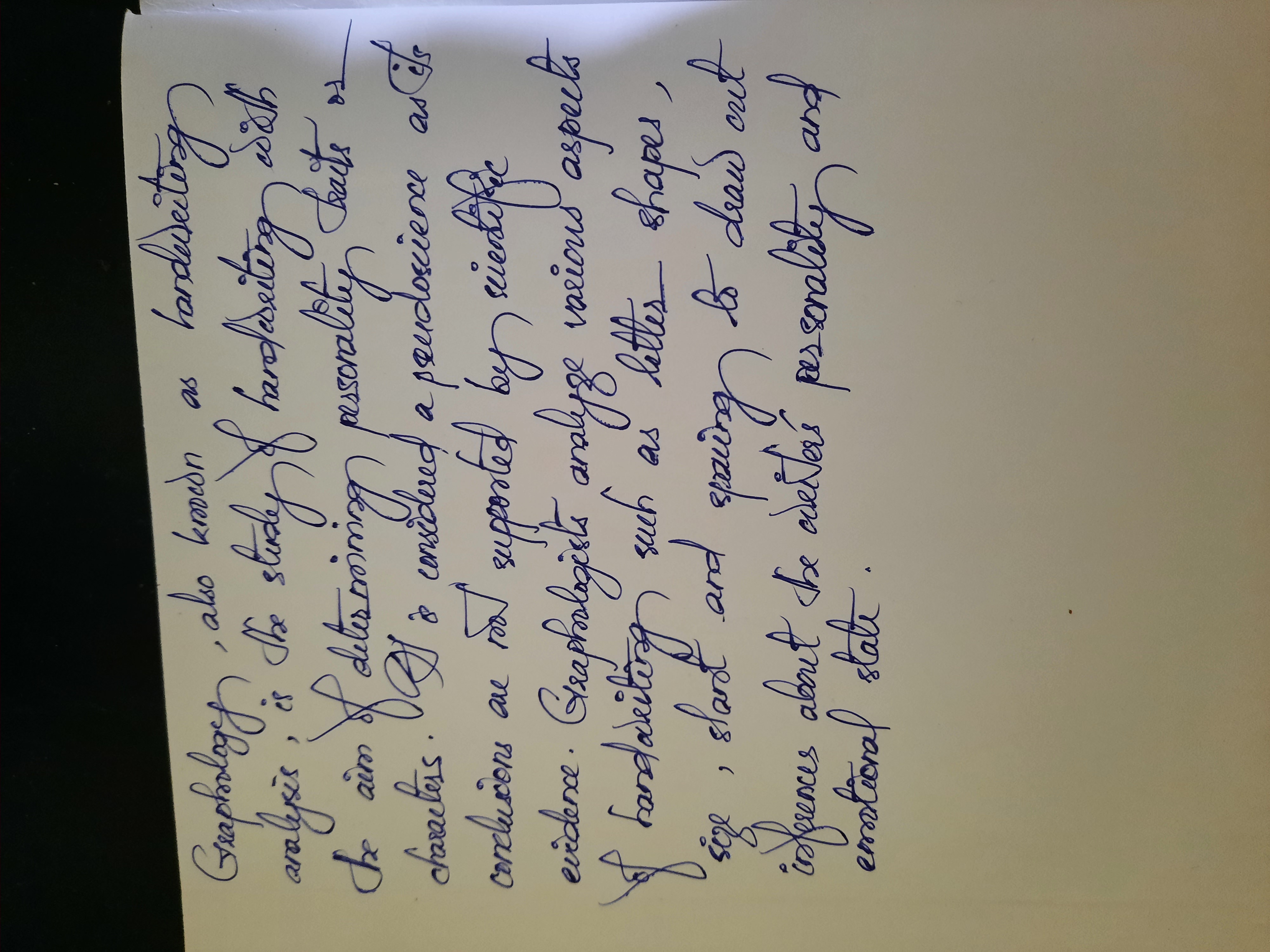 The handwriting sample exhibits a flowing, cursive style, with many letters connected and rounded forms. There's a distinct loopiness, particularly noticeable in the ascenders and descenders of letters like 'g' and 'f', seen in words such as "Graphology" and "handwriting". The spacing between words appears somewhat inconsistent, with some areas feeling crowded while others are more open. The slant of the handwriting is relatively consistent, leaning slightly to the right. While generally legible, some letter formations could be clearer to enhance readability. There's a certain elegance in the loops and curves, suggesting a desire for aesthetic appeal in expression.