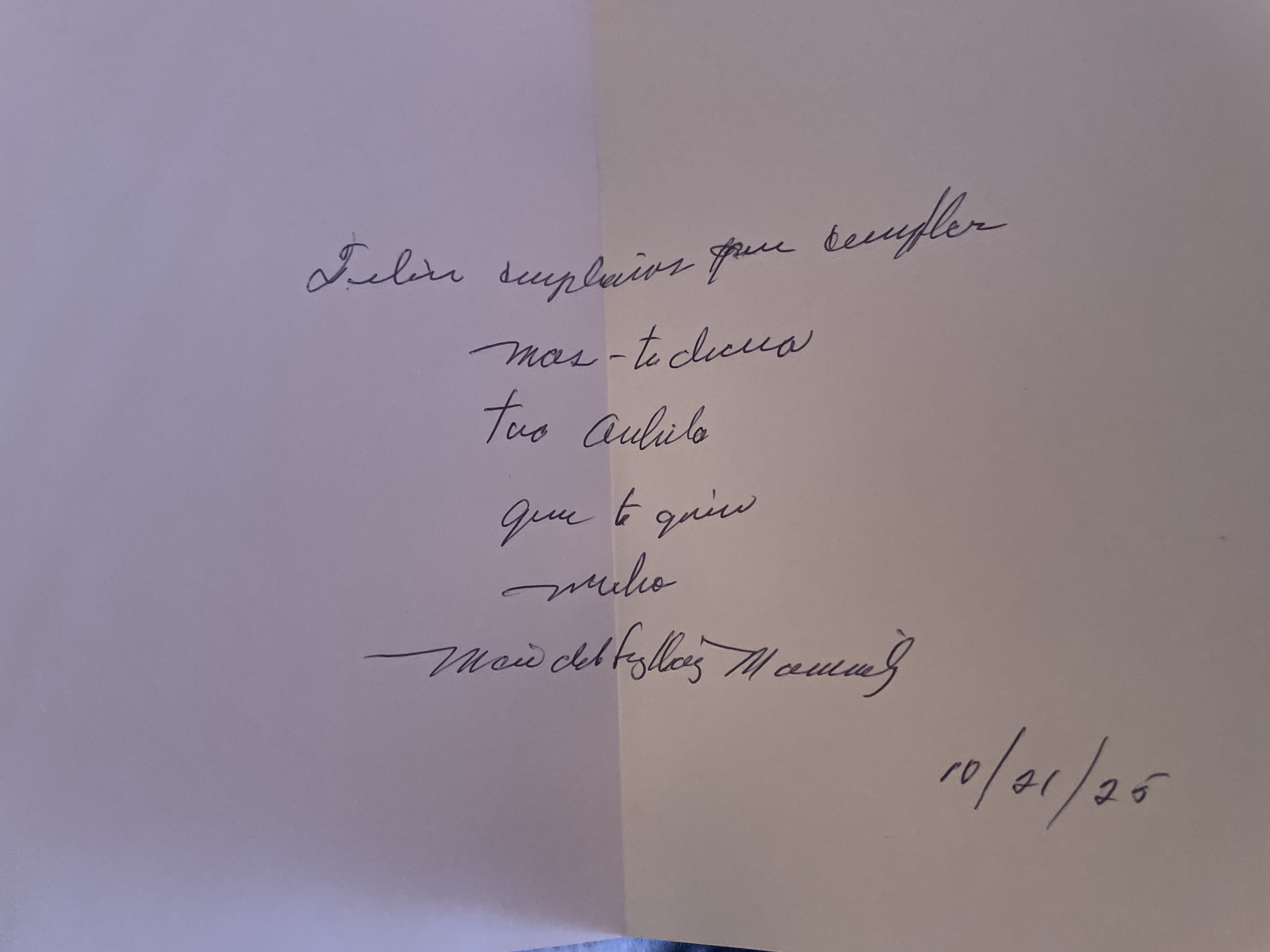 This handwriting dances across the page with a playful, yet purposeful, stroke. The letters are connected, suggesting a fluid thought process, with a slight rightward slant indicating a forward-looking disposition. The pressure appears moderate, hinting at a balance between assertion and sensitivity. The loops, as seen in the 'l' and 'q', are full, hinting at expressiveness and an openness to new experiences. The baseline wavers gently, adding a touch of whimsy to the overall presentation. There is a noticeable rhythm in the strokes, as exemplified in the words 'mucho' and 'Feliz cumpleaΓ±os'.