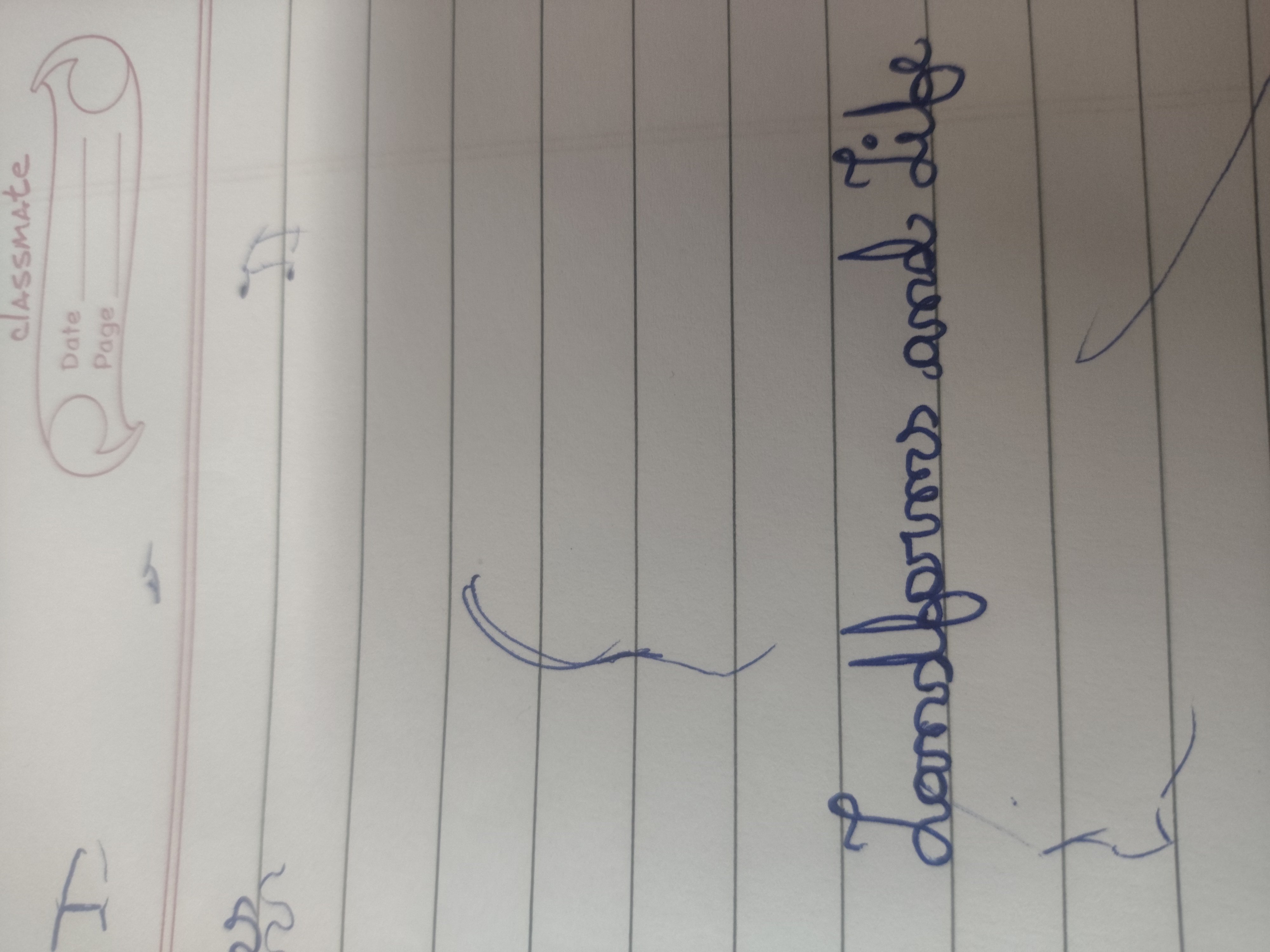 The handwriting is characterized by its looping, almost cursive style, evident in words like "landforms" and "life". There is a certain roundness to the letter formations, creating a soft and gentle appearance. The slant is minimal, suggesting a balanced approach. The writing appears fluid, but the word spacing could be more consistent.