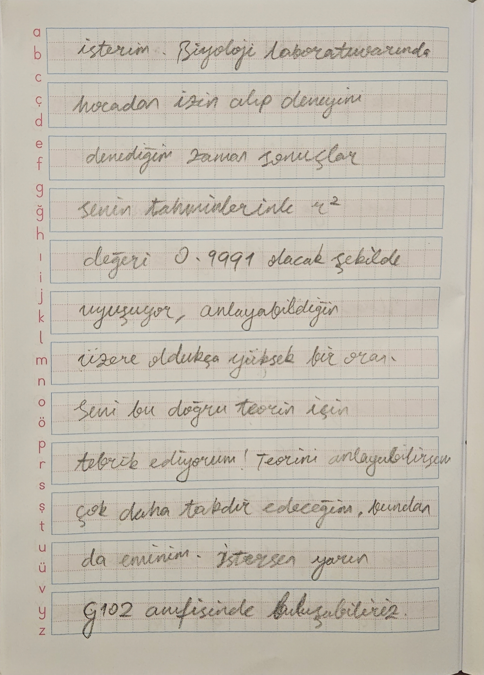 The handwriting exhibits a flowing and connected style, where letters within words are often linked, as seen in phrases like "Biyoloji laboratuvarında" and "anlayabildiğin". The writing leans slightly to the right, suggesting a forward-thinking and possibly impulsive nature. The letter formations are generally rounded, which contributes to the overall friendly and approachable feel of the handwriting. However, there's a degree of inconsistency in letter size and spacing, indicating perhaps a variable level of focus or attention to detail.
