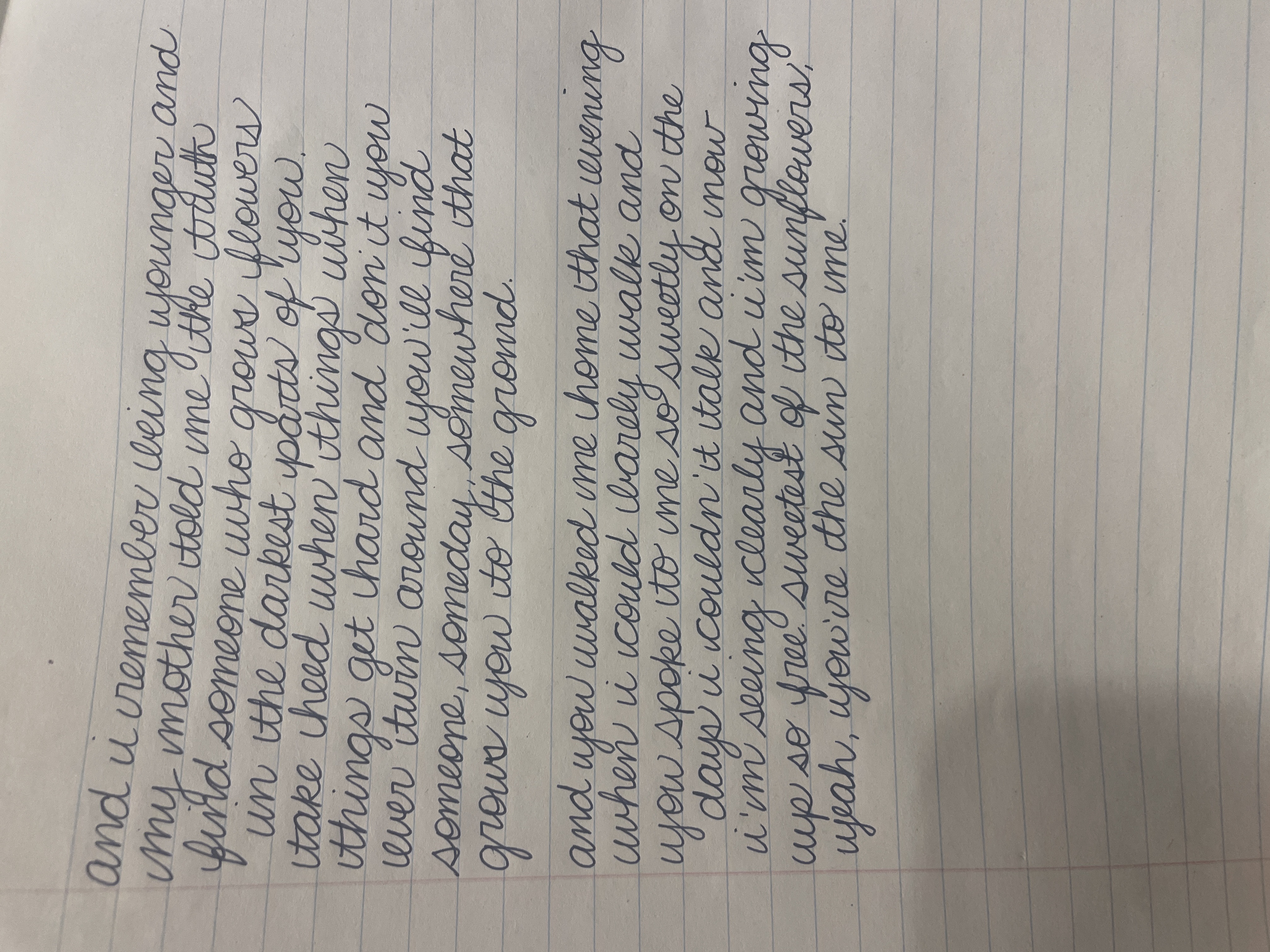 To improve, focus on maintaining consistent letter size and baseline alignment. Practicing letter formation drills, particularly for letters like 'i' and 't' where the distinctions are subtle, could enhance legibility. While the current style is charming, refining the consistency could further enhance clarity and professional appearance. Pay more attention to spelling!