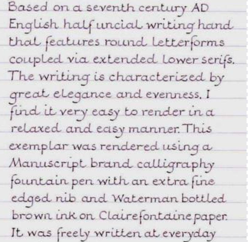 This handwriting presents a meticulously crafted style, reminiscent of a historical script. The "round letterforms" are consistently executed, displaying a uniform rhythm and flow. The "extended lower serifs" add a touch of elegance and sophistication, contributing to the overall aesthetic appeal. The writing exhibits excellent spacing and proportion, creating a visually balanced and harmonious composition. The handwriting is neat and exceptionally legible.