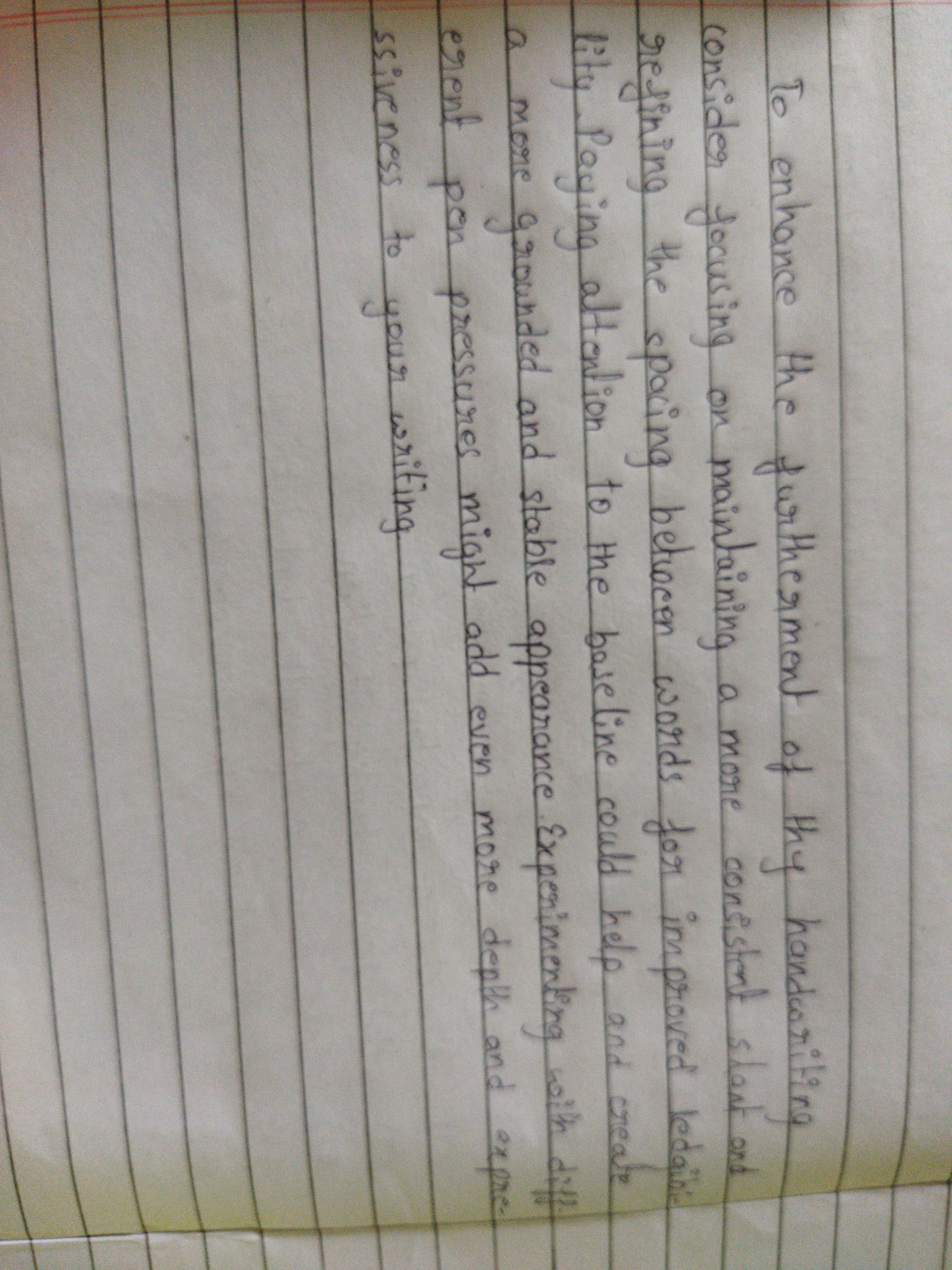 To further enhance your handwriting, focus on maintaining a more consistent baseline. Practicing letter connections and ensuring uniform spacing between words can improve legibility and create a more polished appearance. Experimenting with different pen pressures, as you suggested, could add depth and character to your writing, making it even more expressive.
