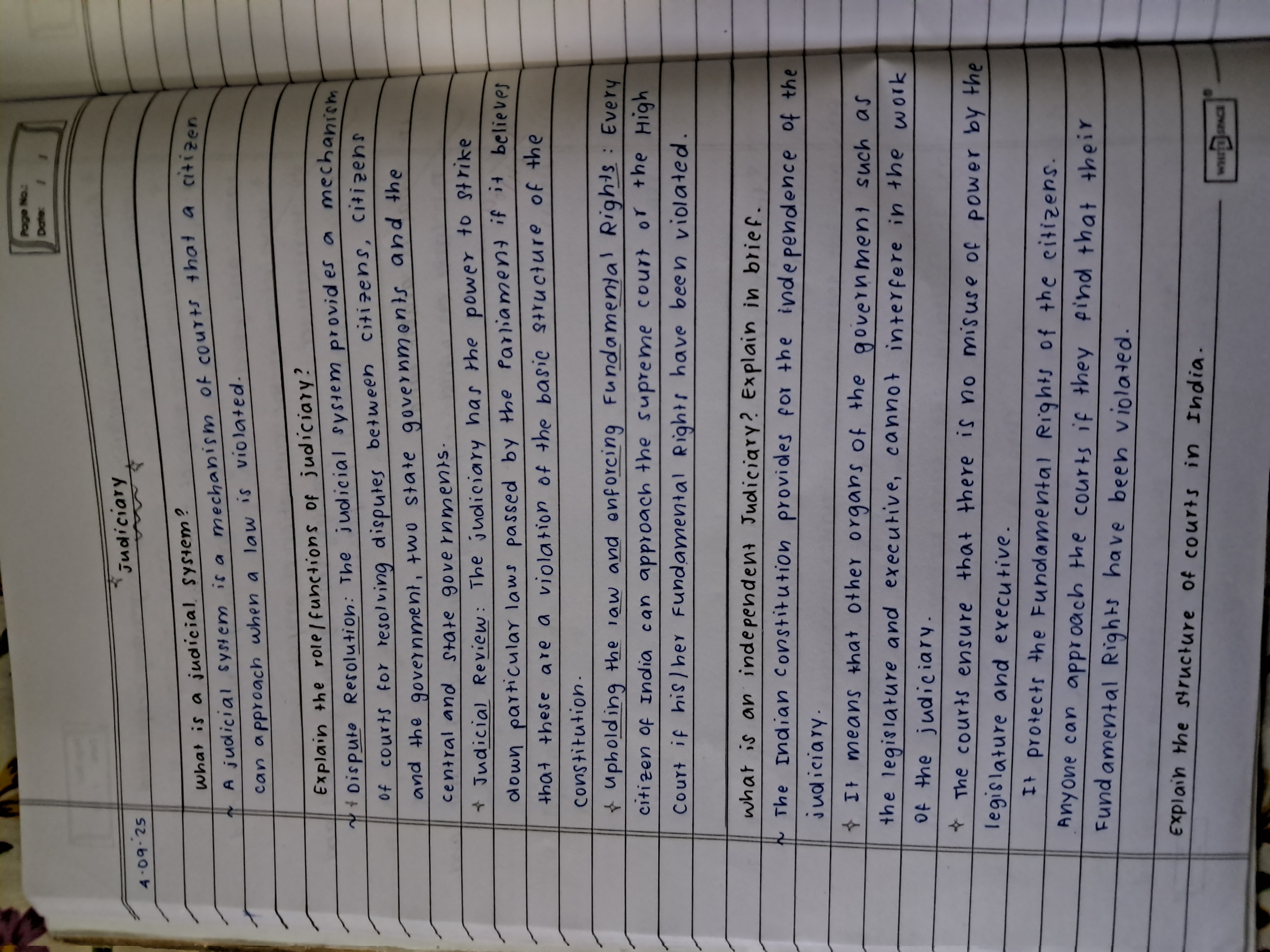 The handwriting is characterized by its upright posture and consistent letter formation. There is a noticeable effort towards neatness and legibility, with letters being clearly defined and spaced, as seen in phrases like "Judicial system" and "Fundamental Rights". The uniformity in size and shape suggests a controlled and methodical approach to writing. The overall impression is one of precision and order.