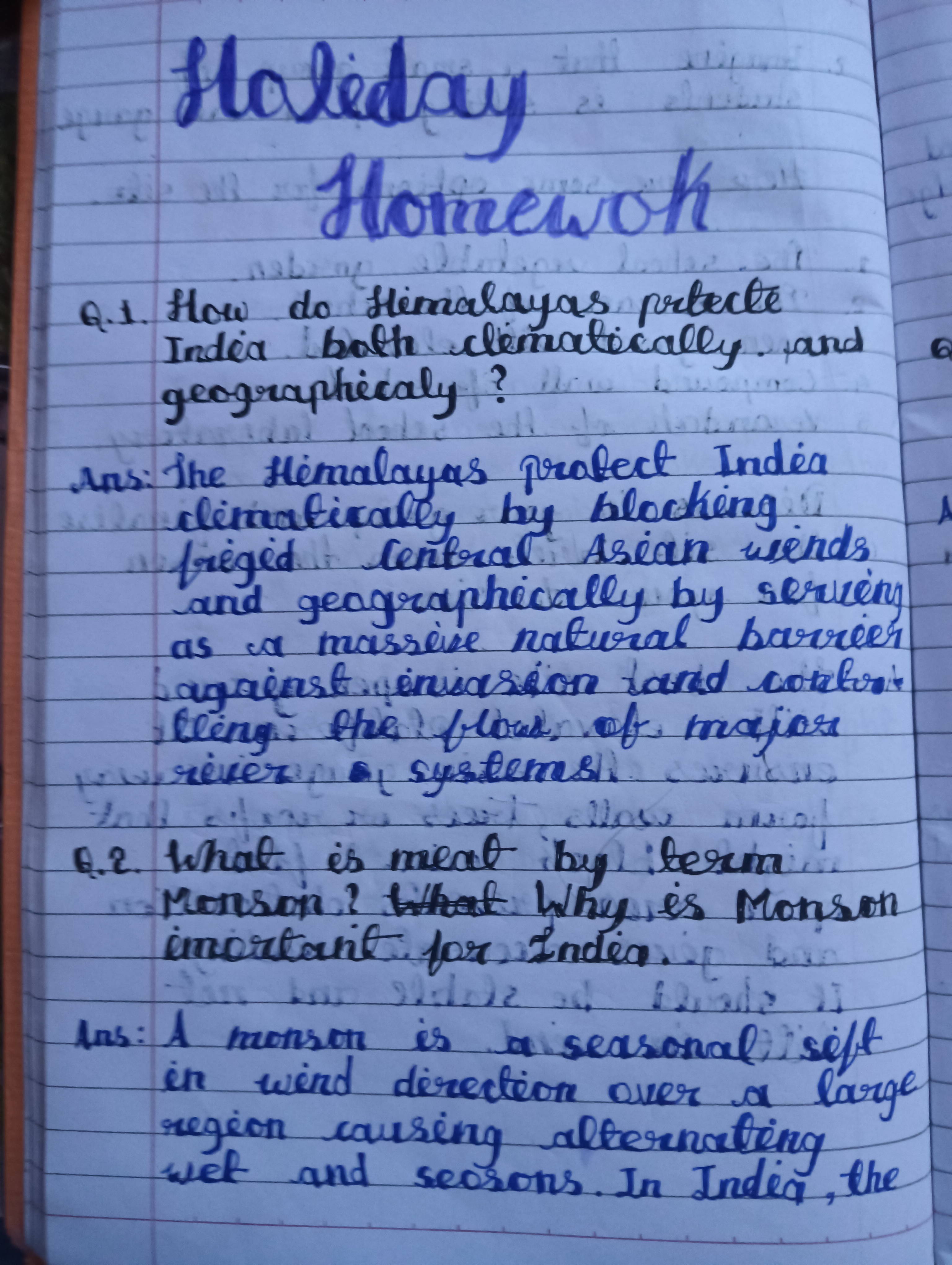 The handwriting exhibits a blend of cursive and print styles, seen in the connecting strokes within words like "Himalayas" and the distinct letter formations such as in "geographically". The writing leans slightly to the right. There is some inconsistency in letter size, with some letters appearing larger than others, affecting the overall neatness. The spacing between words varies, contributing to a slightly irregular appearance. While the writing is mostly legible, some words like "prtecte" and "venisasion" are misspelled, affecting readability.