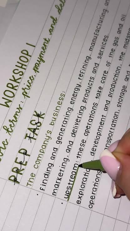 The handwriting exhibits a careful and deliberate style, with uniform letter sizing and spacing. The vertical strokes are consistent, lending a structured appearance. Words like "WORKSHOP" and "PREP TASK" are written with an italicized font, showing some flair and emphasis. The handwriting shows good adherence to the ruled lines, indicating control and neatness. Overall, the writing is legible and well-formed, with rounded characters. The use of a consistent pen and ink color adds to the uniformity and organization of the notes.