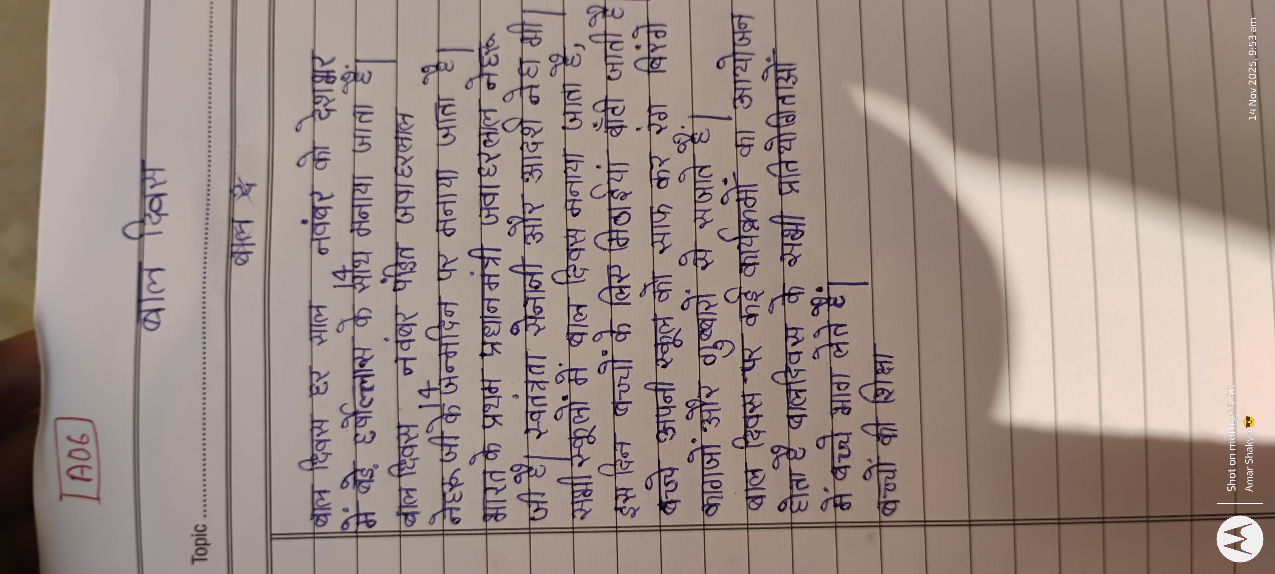 The handwriting presents as upright and somewhat rounded, with a consistent baseline. The letter formations are relatively simple and legible, showing a degree of care and attention to detail, as seen in the clearly defined 'बाल दिवस' at the top. There's a uniformity in letter size and spacing, suggesting a methodical approach to writing. The pressure appears to be moderate and consistent throughout the sample.