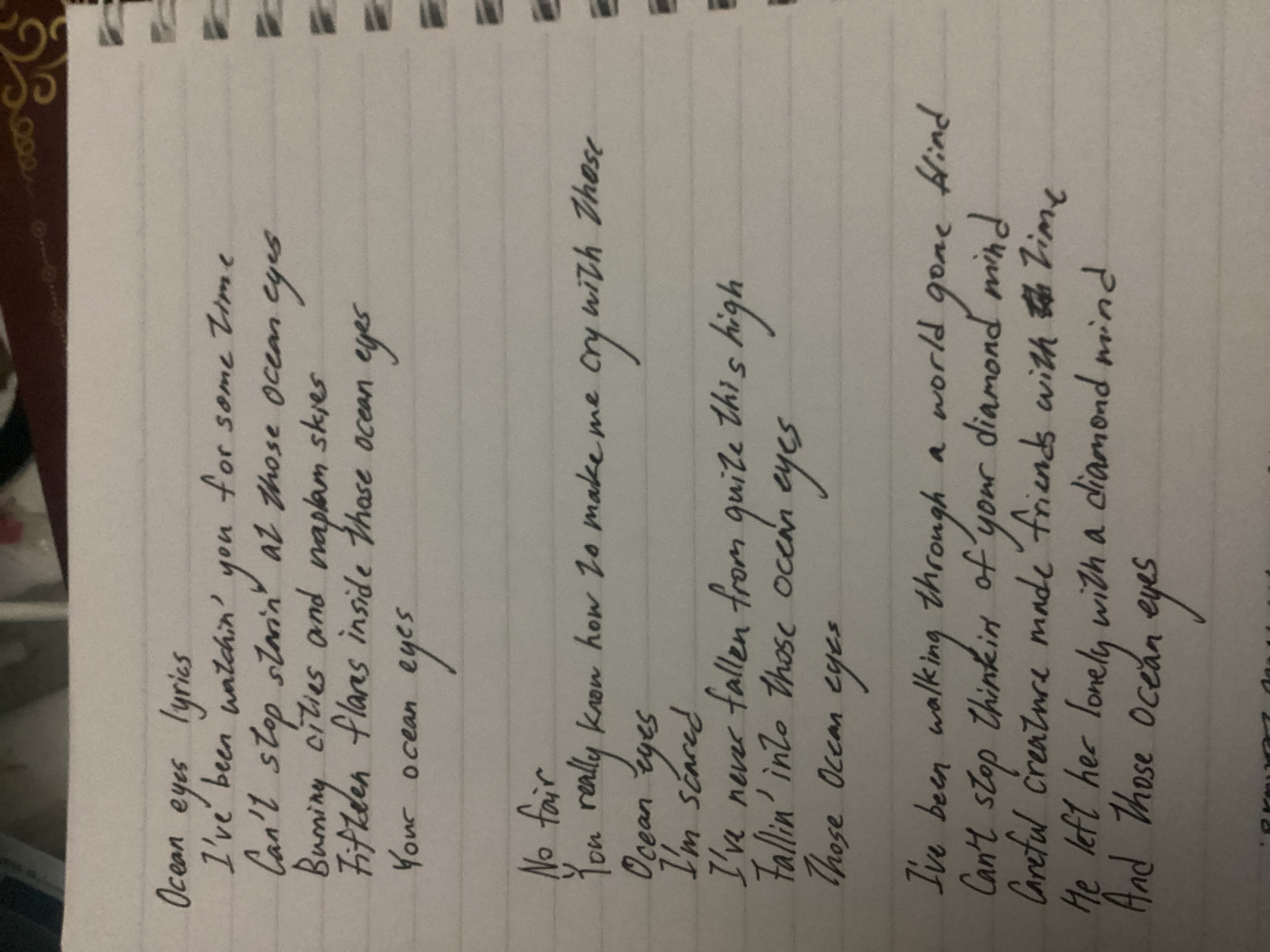 The handwriting style is characterized by a moderate slant to the right, suggesting an open and expressive nature. The letter formations are generally rounded, giving the writing a soft and approachable feel. There's a sense of rhythm and flow, with connecting strokes that link the letters within words, although this fluency is occasionally interrupted by abrupt stops, such as in the word "watchin'." The size is fairly consistent, contributing to overall legibility, although the baseline wavers somewhat, indicating a degree of impulsivity or emotional variability. Some words like "eyes" are consistently used throughout the text.