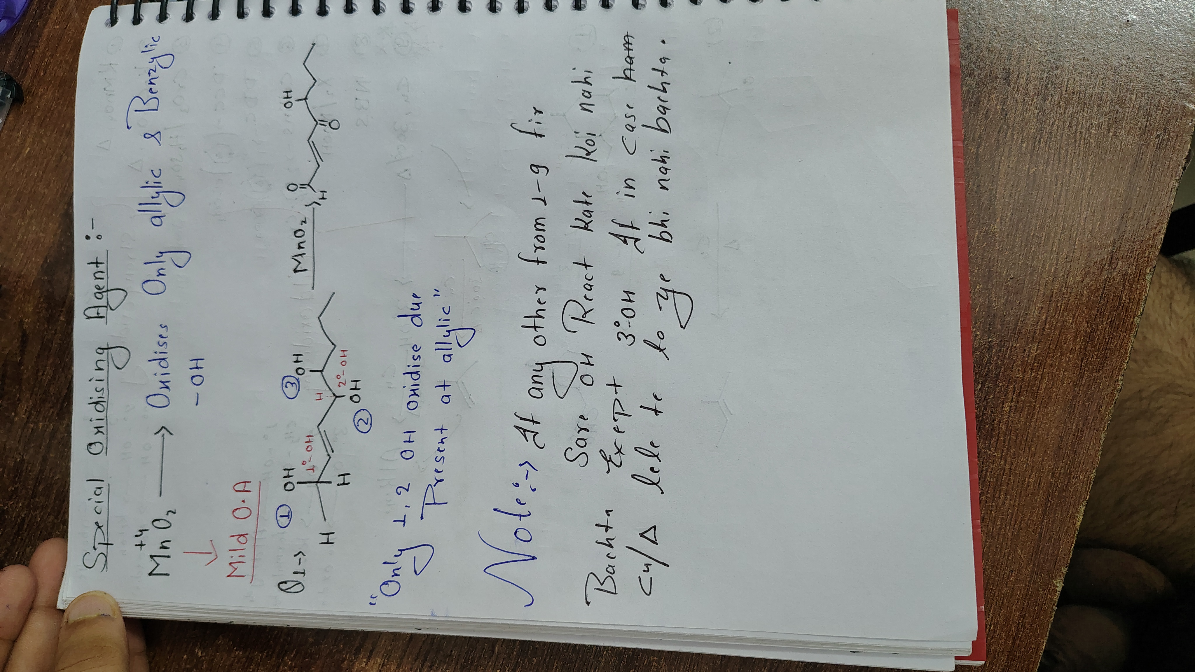 The handwriting presents a mix of careful, deliberate strokes and more fluid, almost cursive elements. Capital letters, especially in headings like "Special Oxidising Agent", are formed with an almost artistic flourish, showcasing a desire for emphasis and perhaps a touch of flair. The smaller script, used for explanations and notes, exhibits a slightly more hurried pace, but remains generally legible, even with the occasional abbreviation and the use of scientific notation. There's a clear distinction between the more formal presentation of main ideas and the more relaxed, almost conversational tone of the notes, such as "Note:-> At any other from 1-9 fir".