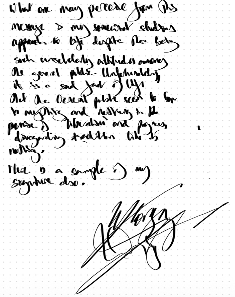 This handwriting possesses a bold and sweeping style, characterized by strong, confident strokes. The letters lean forward with enthusiasm, yet the consistency wavers, like the difference between "message" and "signature". Some words appear almost carelessly thrown onto the page, while others show deliberate flourish. The generous spacing between lines suggests an open mind, though the overall impression is one of impatience. The signature, a wild tangle of lines, is the most telling of all, a symbol of freedom and untamed spirit.