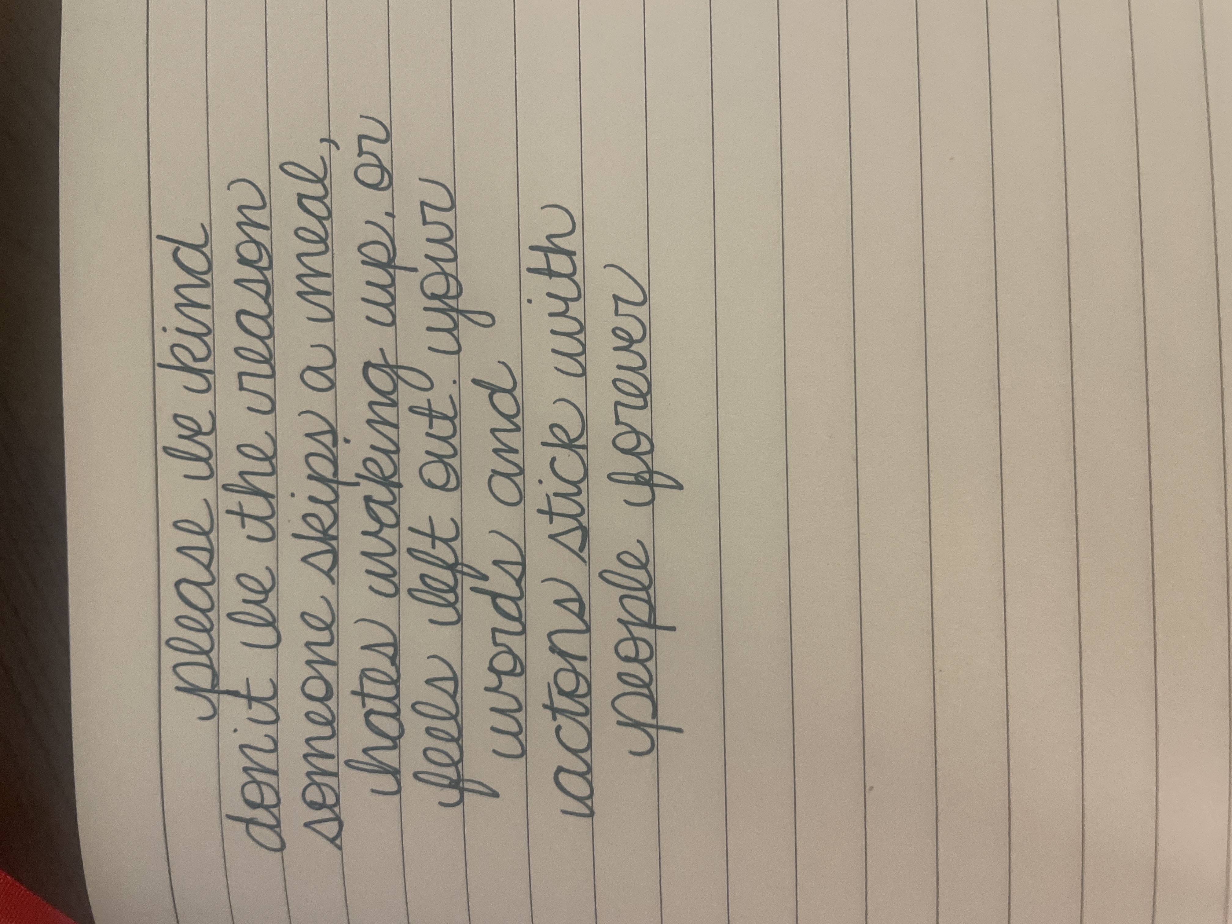 The personality traits suggested by this handwriting are empathy, conscientiousness, and a thoughtful nature, reflecting the content of the message itself. The consistent slant and flowing style point towards a person who is optimistic and forward-thinking. The neatness and adherence to the lines reveal a sense of order and discipline. The writer likely values harmony and balance in their life and strives to create a positive impact on those around them, as echoed in the plea to "please be kind."