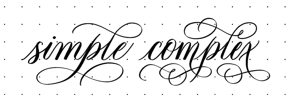 The handwriting style is characterized by elaborate, looping strokes and flourishes. The letters are connected with sweeping curves, creating a sense of fluidity and elegance. The pressure appears to be consistent, resulting in uniform line thickness. Notice the extended loops in letters like 's', 'p', 'l', 'c', 't', and 'x', and the decorative swirls at the beginning and end of the words 'simple' and 'complex'.