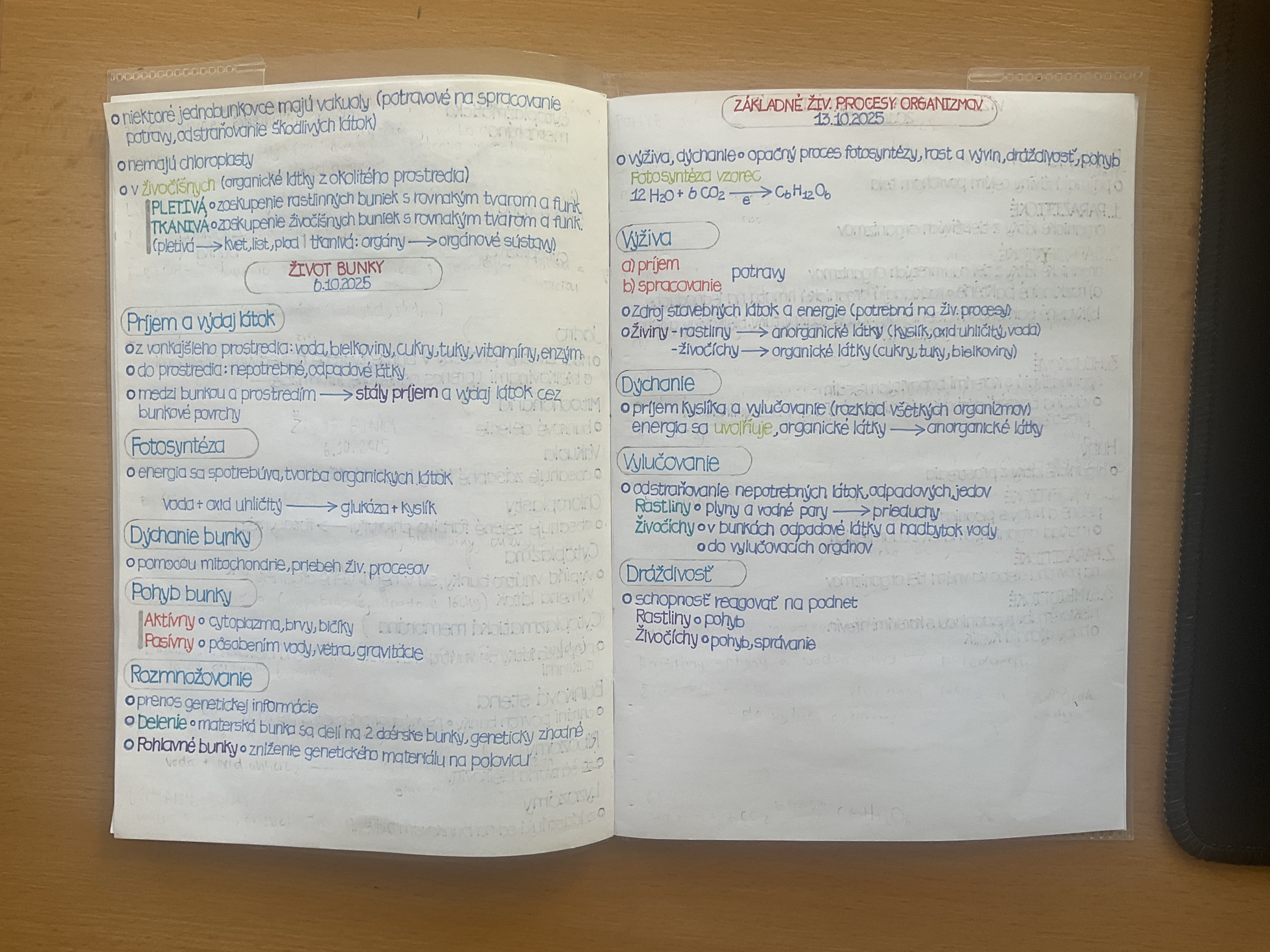 The handwriting presents as neat and organized, clearly designed for efficient note-taking and study. The lettering is mostly upright with a slight slant, suggesting a practical approach to communication. Spacing between words and lines is consistent, enhancing legibility. The use of bullet points and headings like "ŽIVOT BUNKY" and "Fotosyntéza" indicate a structured and methodical approach to the subject matter.
