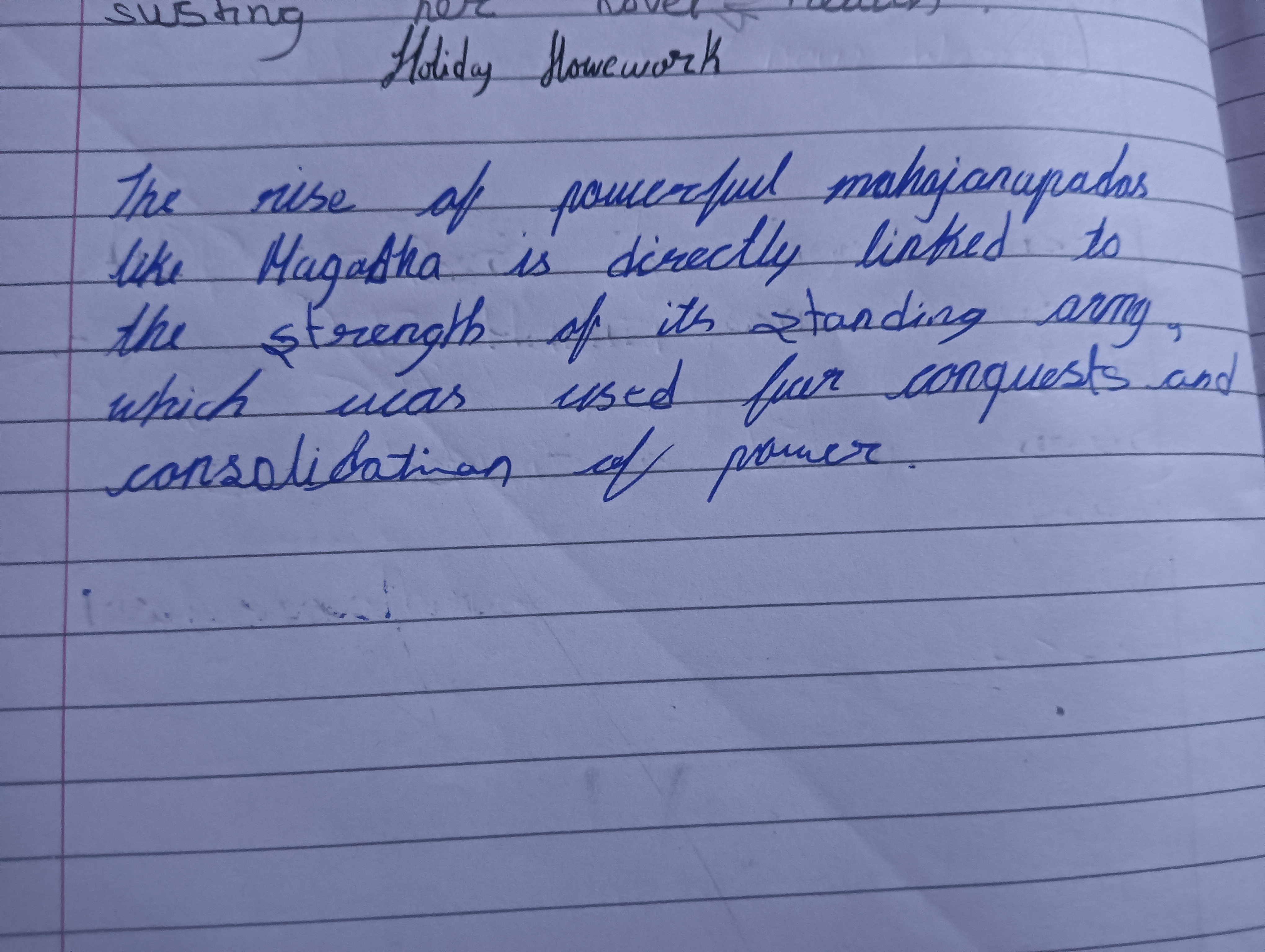 The handwriting sample presents a generally neat and legible style, exhibiting a flowing, connected script. The letter forms are rounded and the strokes appear deliberate, particularly evident in words like "powerful" and "strength". There is a slight slant to the right, and the size of the letters is relatively consistent, although some variations exist, as seen in "mahajanapadas" and "consolidation". The spacing between words is adequate, contributing to the overall readability of the text. However, the ascenders and descenders are somewhat short, giving the writing a slightly compressed appearance.
